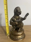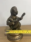 The product is a brass sculpture depicting a monkey playing the mandolin while sitting on a pedestal. The intricate details of the monkey and the musical instrument are captured in the design, showcasing a playful and whimsical scene. The use of brass as the material adds a touch of elegance and durability to the sculpture, making it a unique art piece that would stand out in any art collection or display. Preowned it is in good condition It is 7.5 inches tall and 4.5 inches in diameter Please refer to pictures before making your purchase