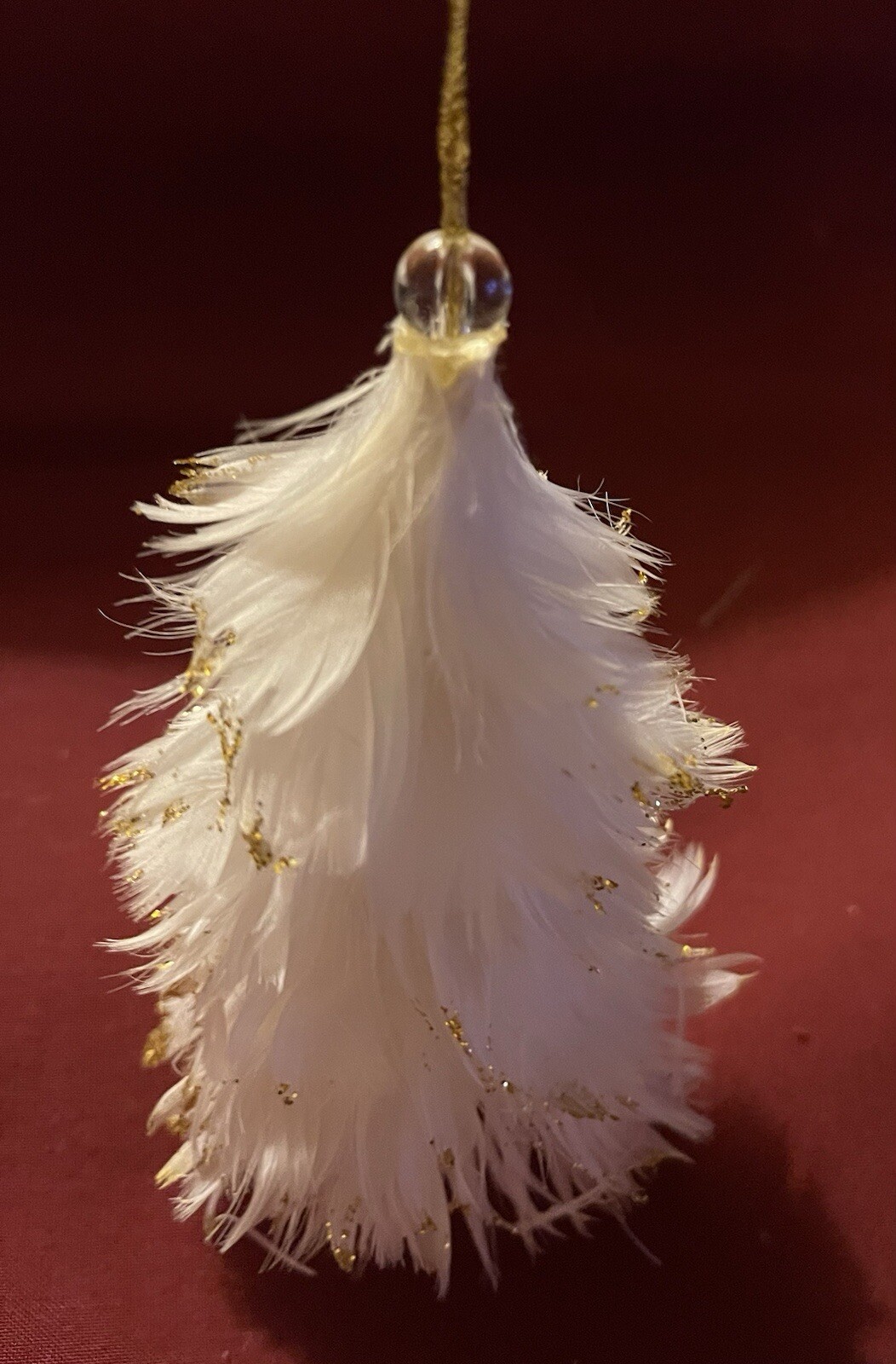 Unique vintage feathered Christmas tree ornament with gold on the edges. Possibly from the 1950s. Good condition. Please see photos for complete description.
