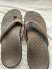 Shoes are in gently used condition with normal wear as shown in photos. Experience the perfect blend of comfort and style with the Vionic Tide II sandals, designed for women who appreciate a chic yet practical aesthetic. These bronze metallic flip flops embody elegance in a synthetic upper material that offers durability and a sleek finish. Ideal for sunny days and casual outings, they're a versatile addition to any wardrobe. With a size 9 fit, these sandals are tailored to provide support for all-day wear. The Vionic Tide series is known for its reliable comfort, and the Tide II model upholds that legacy, ensuring a smooth stride with every step. Whether you're heading to the beach or a leisurely stroll in the park, these sandals are your go-to footwear choice.