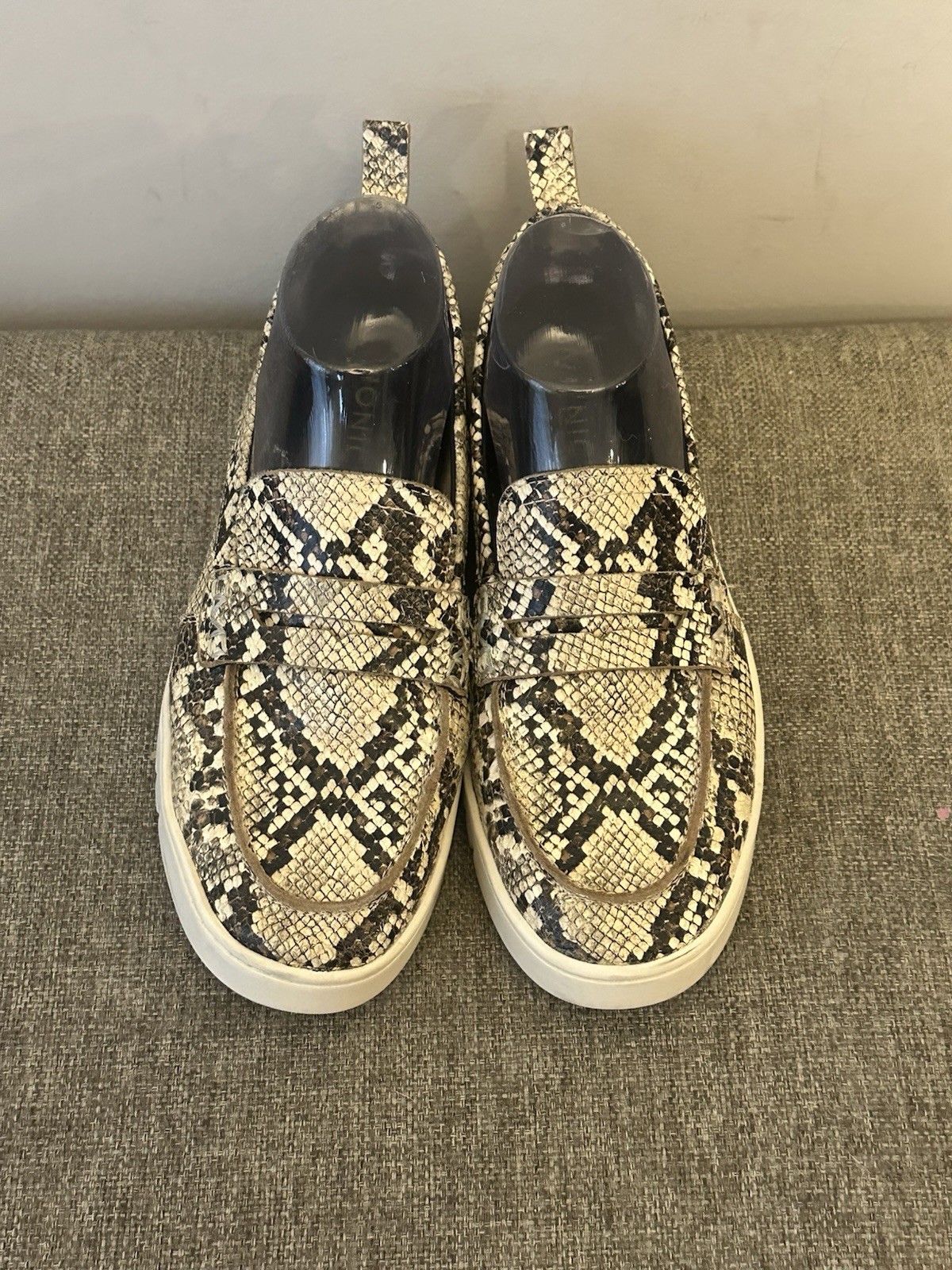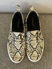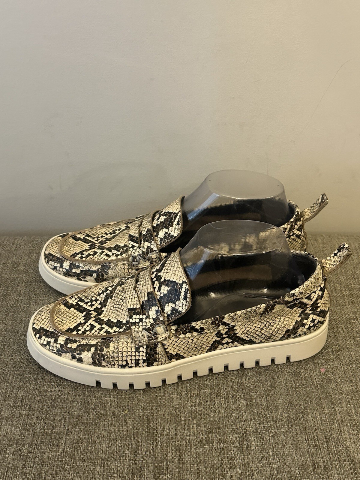 The Vionic Uptown Woman's Snakeskin Loafers in size 8 are a stylish and comfortable pair of shoes perfect for casual or business occasions. Featuring a trendy animal print pattern with a snake theme, these flat loafers offer arch support and a comfortable insole made of fabric. The black leather upper and lining, along with a rubber outsole, ensure durability and a fashionable look. Ideal for women looking for a blend of style and functionality in their footwear. Preowned Good Condition