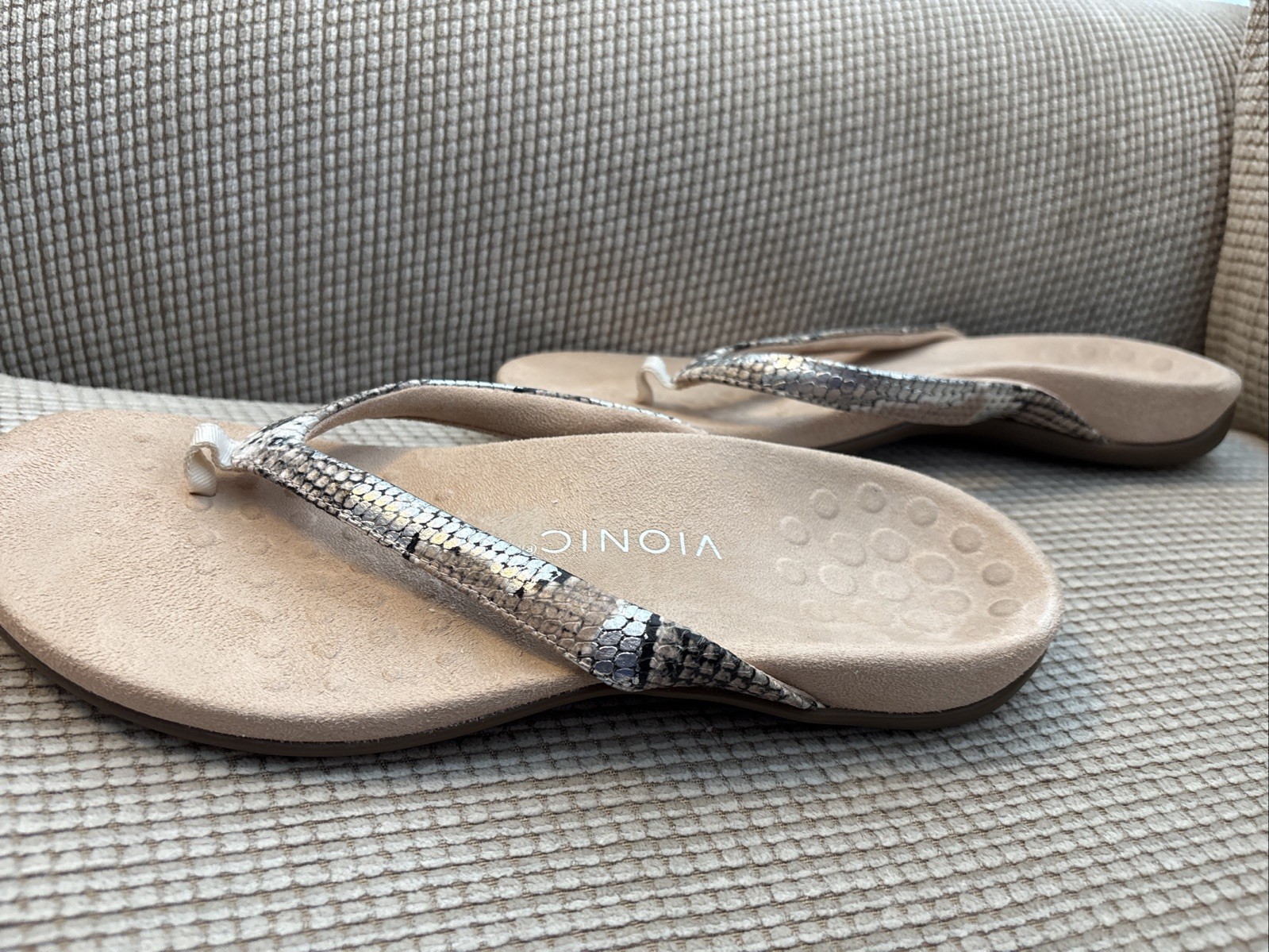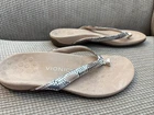 Step into summer with the Vionic Women's Davina Toe Post Sandals. Featuring a bold snake print leather upper and a comfortable thong style design, these sandals are perfect for any casual occasion or your next summer getaway. The sandals offer arch support, orthotic-friendly comfort, and breathable fabric lining making them ideal for all-day wear. The flat rubber outsole provides a stable and reliable grip on any surface while the standard width ensures a comfortable fit for most foot shapes. The Davina sandals are a great addition to any summer wardrobe, offering both style and comfort in one versatile shoe.