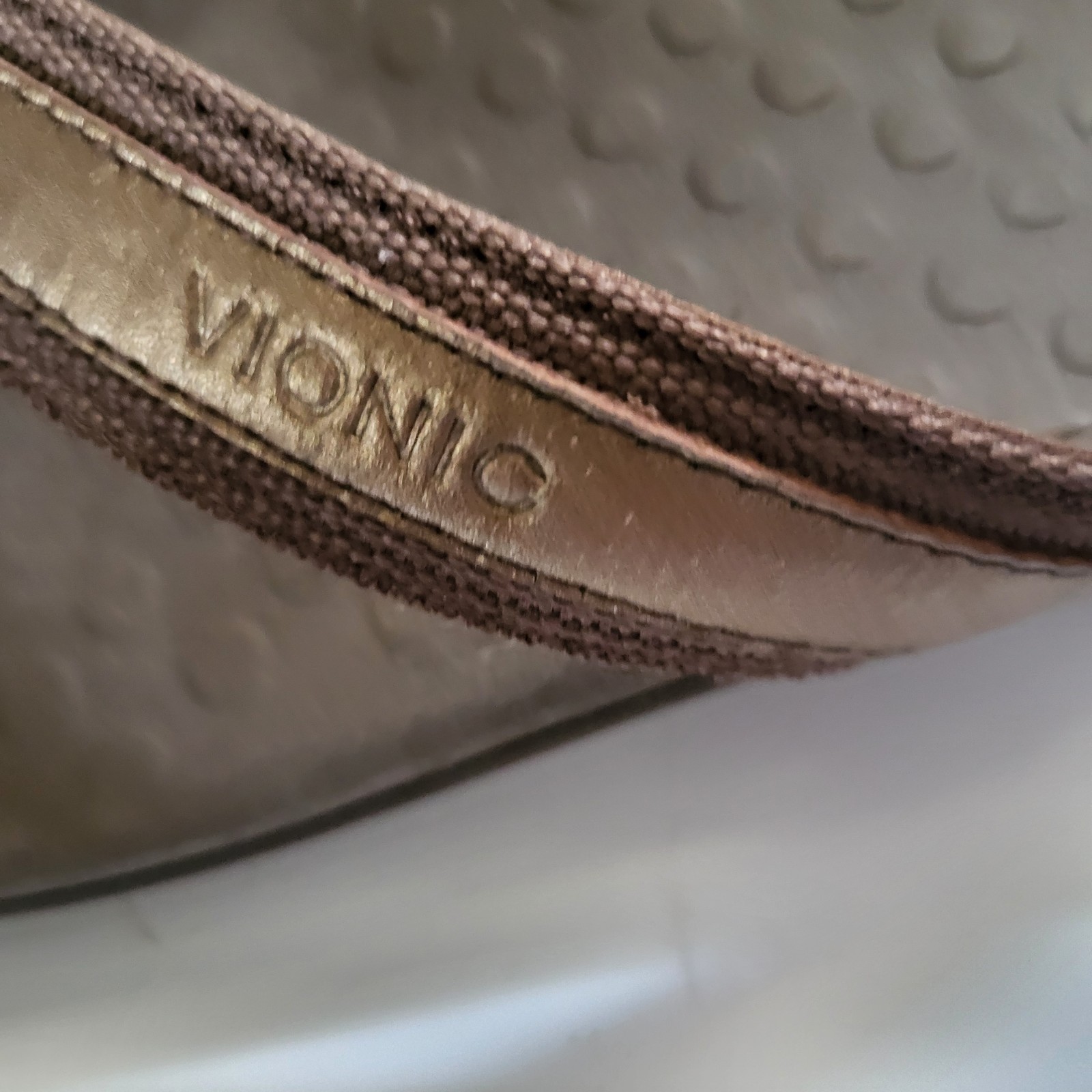 The Vionic Women's Bronze Tide II Metallic Leather Thong Sandals in size 10 are stylish and comfortable footwear perfect for any summer outing. The bronze color and metallic theme add a touch of glam to the classic thong design. Made with high-quality leather, these sandals are durable and sure to become a go-to option in your wardrobe. The Vionic Tide II model provides support and stability, making these sandals a practical choice for everyday weaar.