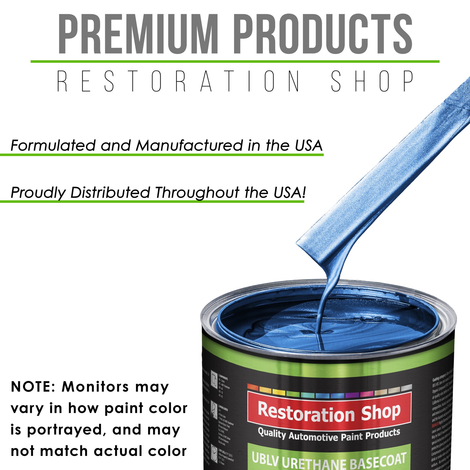 TCP Global Ebay Storefront Ordering | Shipping | Returns | International Product Information FLAMMABLE/HAZARDOUS ITEMS ARE SHIPPED VIA UPS GROUND/STANDARD TO THE LOWER 48 U.S. STATES & CANADA. ***SHIPPING VIA U.S. POSTAL SERVICE OR TO A P.O. BOX IS NOT AVAILABLE.*** RUSH AIR SHIPPING IS AVAILABLE IN CONTINENTAL U.S. FOR AN ADDITIONAL HAZMAT AIR SHIPPING CHARGE. CONTACT US PRIOR TO ORDERING FOR AIR SHIPPING QUOTE. IF ORDER IS PLACE FOR AIR SHIPPING YOU WILL BE CONTACTED FOR ADDITIONAL SHIPPING PAYMENT. INTERNATIONAL SHIPPING IS AVAILABLE. CONTACT US FOR SHIPPING QUOTE PRIOR TO ORDERING. Part# RSP UBLV2508-KIT-S Viper Blue Metallic - LOW VOC Urethane Basecoat with Clearcoat Auto Paint (Complete Slow Gallon Paint Kit) Professional High Gloss Automotive Coating Complete 1 Gallon Restoration Shop - Low 3.5 VOC Urethane Basecoat with Clearcoat Auto Paint Kit with Slow Drying Reducer (Used during hot weather conditions when the temperatures are 85Á F and above). The kit provides 1-1/2 gallons (6 Quarts) of sprayable basecoat color material and 1-1/4 gallons (5 Quarts) of Premium Clearcoat. UBLV Paint Kit includes 1 Gallon of UBLV Low VOC Urethane Basecoat Paint Color, 1 Gallon of XR85 Exempt Slow Urethane Reducer, 1 Gallon of RC4221 High-Gloss Urethane Clear, 1 Quart of RH4201 Urethane Hardener, 5 Pack of 190 Micron Nylon Automotive Strainers and a 5 Pack of Wood Paint Mixing Sticks. The Restoration Shop (UBLV) Low VOC Urethane Basecoat and Premium Clearcoat System is a State-of-the-Art High-Performance Professional Easy-To-Use Paint Coating System that is Designed to Reproduce the Hi-Tech O.E.M. Automotive Finishes Found on Today's Vehicles. UBLV is an easy to spray fast-drying basecoat/clearcoat system that provides a long-lasting and very high gloss topcoat finish result. UBLV is an extremely durable, chemical and solvent resistant coating that also resists chipping, cracking, and UV ray fading. Restoration Shop's (UBLV) is a Low 3.5 VOC compliant basecoat/clearcoat paint system that may be used in National Rule or Low 3.5 VOC limit States when using it with the proper XR series reducers. Note: Monitors vary - onscreen colors are for general color reference only. Restoration Shop (UBLV) LOW VOC URETHANE BASECOAT with CLEARCOAT - COMPLETE SLOW GALLON PAINT KIT Includes: 1 - Gallon of Restoration Shop Low 3.5 VOC Premium Urethane Basecoat Auto Paint Color 1 - Gallon of Slow (85¡ F and above) Exempt Urethane Reducer (RSP XR85-GL) 1 - Gallon of High-Gloss Urethane Clear (RSP RC4221-GL) 1 - Quart of Urethane Hardener (RSP RH4201-QT) 5 - Each Premium 190 Micron Nylon Automotive Strainers 5 - Each Wood Paint Mixing Sticks UBLV Paint Color has a 2 to 1 Mixing Ratio, 2 parts UBLV Paint Color to 1 part XR Urethane Reducer. UBVL Basecoat color requires a 2 to 1 mix ratio with the included slow drying (85¡ F and above) XR exempt urethane reducer before spraying. Restoration Shop High-Gloss Urethane Clear (RSP RC4221) has a 4 to 1 Mix Ratio, 4 parts Urethane Clearcoat to 1 part Urethane Hardener A 2.1 VOC conventional solid polyurethane clearcoat. A two-component (2K) polyurethane clearcoat formulated to offer ease of application, great flow and leveling, excellent durability, and high-gloss. This high-quality clearcoat is the preferred high production topcoat that professionals use in today's high-end auto body shops. This clearcoat is used for overall application, and is also used for spots and panels. The clearcoat is VOC compliant for all multi-stage topcoat systems, and can also be applied on top of other basecoat brands. Optional Reducers Available Separately XR Series Exempt Reducers to Maintain a 3.5 VOC Level: XR60 Exempt Fast Reducer 60-70¡ F; XR70 Exempt Medium Reducer 70-85¡ F; XR85 Exempt Slow Reducer 85¡ F and above Since 1974, Restoration Shop has been a Trusted Top Quality Brand and The Source for Innovative Premium Quality Automotive Products! Restoration Shop Low VOC UB Urethane Basecoat is a state-of-the-art basecoat designed to reproduce the hi-tech O.E.M. finishes found on today's vehicles. It features outstanding coverage, rapid dry time, excellent metallic control and optimum repairability. UBLV provides an environmentally friendly solvent solution. View all categories Warehouse Locations San Diego, California South Carolina