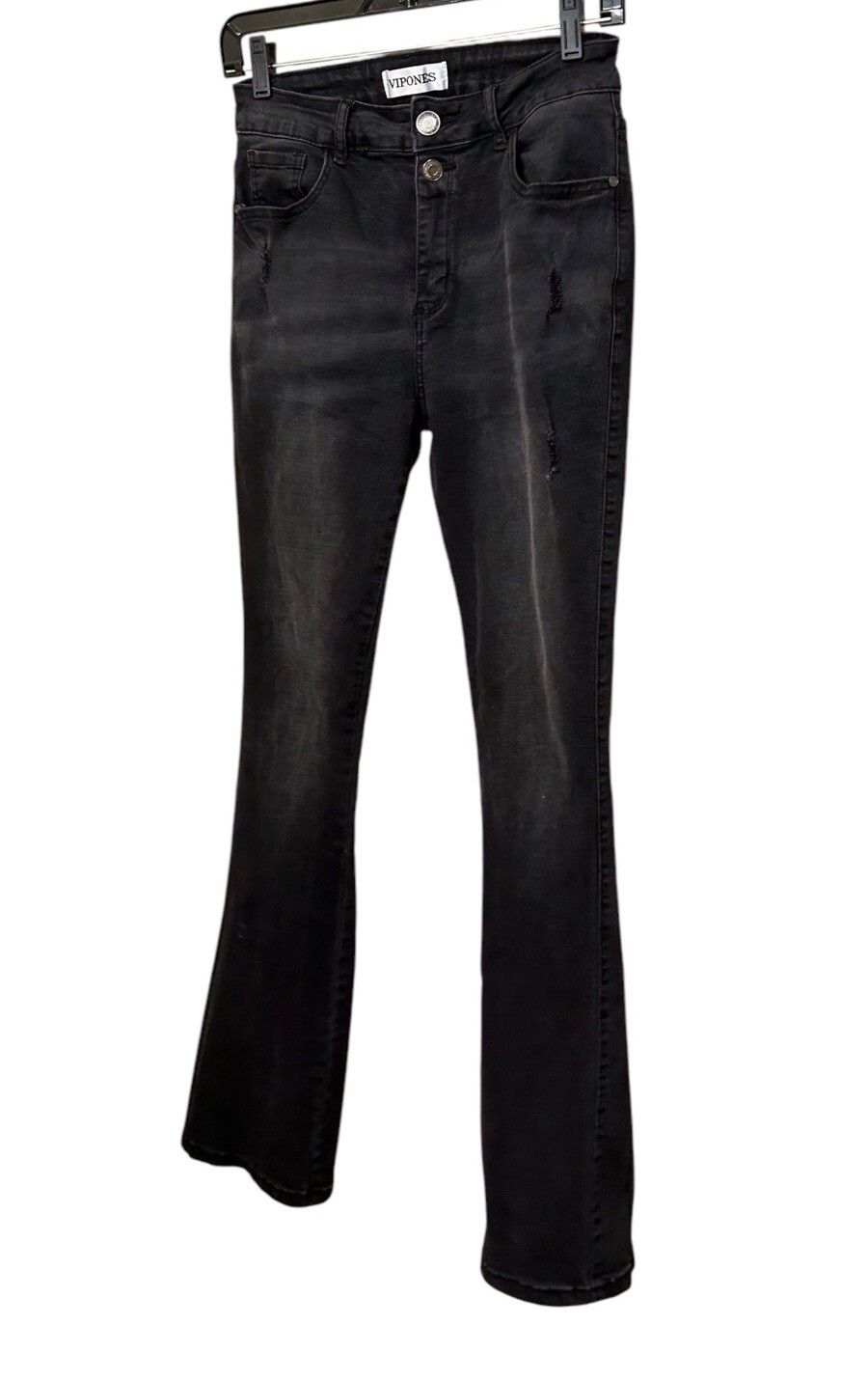 Vipones Flared Jeans Women Size 6 Black Distressed Mid Rise Stretchy Comfort Brand: Vipones Style: Flare jeans Good used condition. Normal sign of wear and tear, there is one small spot on one leg. Light fading throughout. Please study pictures carefully before purchasing Please review the pictures carefully for condition, details, and measurements. We do our best to describe accurately all of our items. The Approx. Measurements Laying Flat (not doubled) are the following: 41" Waist to bottom length 31.5" Inseam 13" Waist 10" Rise 8.5" leg width 8.75" Leg opening Feel free to ask any questions. Thank you for visiting our store! 8