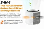 Viqtta 3-in-1 True HEPA Replacement Filter for Core 300 / P300 Air Purifier (2 Pack) Keep your air purifier running smoothly with this Viqtta 3-in-1 True HEPA Replacement Filter Pack . Each round cartridge combines a pre-filter, True HEPA layer, and an activated carbon layer to help maintain a fresher indoor environment for everyday home or office use. Key Features 3-in-1 Filtration Design – Includes a pre-filter, True HEPA layer, and activated carbon layer working together for effective performance. True HEPA Layer – Helps capture very fine airborne particles such as dust, pet dander, and pollen. Activated Carbon Layer – Helps reduce common household odors from cooking, pets, and smoke. Pre-Filter – Helps trap larger particles to support the life of the inner filter layers. Easy to Install – Simply remove the used filter and place the new one into your air purifier. 2 Pack Value – Includes two replacement filters for convenient, cost-effective maintenance. Compatibility Designed for use with air purifiers that accept Core 300 / P300 style round cartridge filters . Please check the size and shape of your original filter before purchasing to ensure a proper fit. Note: This is a compatible replacement filter manufactured by Viqtta. Any model numbers mentioned are for reference and compatibility only. Recommended Replacement Interval For typical household use, replacement is generally suggested every 4–6 months , depending on usage and local air conditions. Homes with pets, smoke, or higher dust levels may require more frequent filter changes. Package Includes 2 × Viqtta 3-in-1 True HEPA Replacement Filters (Core 300 / P300 style) Care & Use Tips Always turn off and unplug your air purifier before replacing the filter. Remove all protective packaging from the new filter before installation. Store spare filters in a cool, dry place away from direct sunlight and moisture.