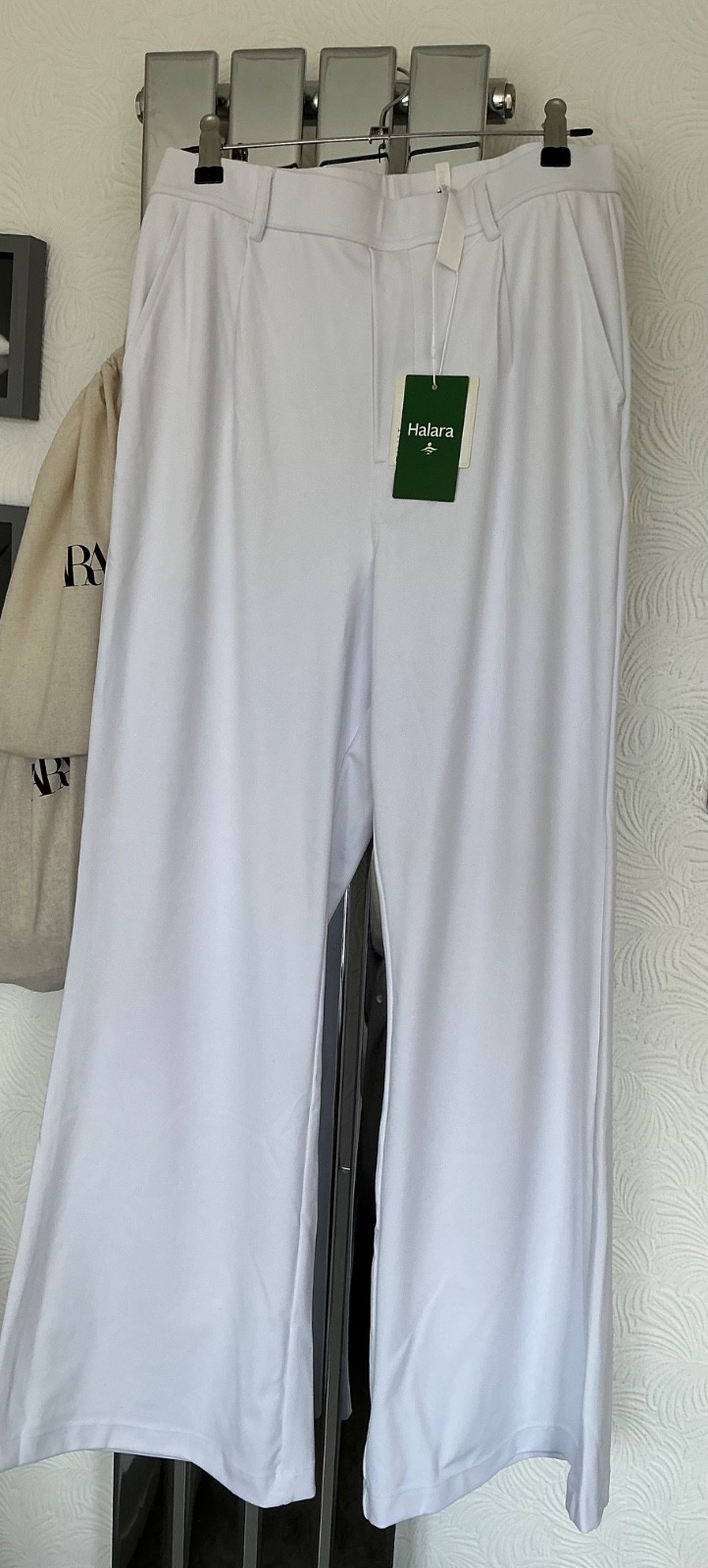 The Halara viral work trousers in white, size M regular, offer super comfortable wear for women. These wide-leg trousers feature a pullover closure, making them easy to slip on and off. The trousers are machine washable and have a mid-rise waist, providing a comfortable fit for everyday wear. The brand Halara is known for its quality and trendy designs, making these trousers a popular choice for those looking for both style and comfort in their work attire. Elasticated waist, not see through at all. stunning trousers.