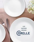 Vitrelle 18-Piece Service for 6 Dinnerware Set, Triple Layer Glass and Chip Resistant, Lightweight Round Plates and Bowls Set, Winter Frost White 18-PIECE SET: Includes (6) 10-1/4-inch dinner plates, (6) 6-3/4-inch appetizer plates and (6) 18-oz soup/cereal bowls. This set has everything you need for a full table service of 6, and it comes with the classic style. LIGHT AND STRONG: Say goodbye to chips and cracks with 's triple-layer-strong glass plates and bowls. This durable dinnerware set is lightweight, easy to handle, and allows for compact stacking, which takes half the space of ceramic dishes. Size Information: Bread and butter Plate: " W x " D, Dinner Plate: " W x " D, Bowl: " W x 3" D LOW MAINTENANCE: This dinnerware set is designed to provide the best dining experience while requiring low maintenance. It's ultra-hygienic, non-porous and easy to clean. Plates and bowls are dishwasher safe and microwave safe. CLASSIC STYLE: If it's not broke, why fix it? 's minimalist approach by way of its crisp, bright and classic design brings a timeless aesthetic to this dinnerware set that blends with most kitchen environments. satisfaction: This item has a 3- satisfaction. TIMELESS BEAUTY: Crafted with pride in Corning, New York, Dinnerware are a staple of modern eating for everyday occasions, filling hearts and tables since 1970. DO NOT USE ON STOVETOP, under a broiler/griller, under a microwave browning element Functional and versatile, this living ware dinnerware set brings timeless and classic styling to your dining experience. Living ware winter Frost set includes 18 pieces total, including six (6) sets of each: 10-1/4-inch dinner plates, 6-3/4-inch bread and butter plates, and 18-ounce soup/cereal bowls. This set features simple and elegant all-white pieces, perfect for complementing your existing dinnerware. All pieces are made of triple-layer strong Glass, which is break and Chip Resistant, lightweight, and easily stackable for space saving. Dishwasher safe, this non-porous and versatile dinnerware can be used in the microwave and oven..