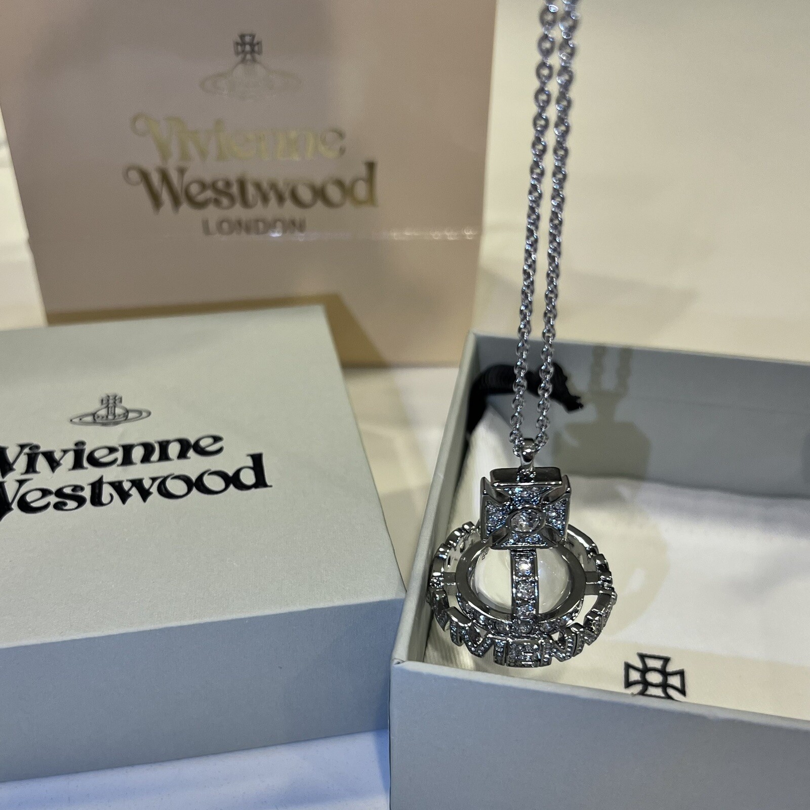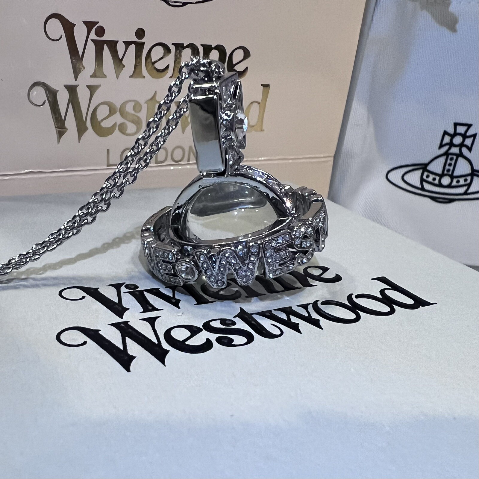 Dimensions: Necklace length is around 27.5inches, orb size is around 1.4 inches Includes the dust bag, box, gift bag and the card Excellent like new condition