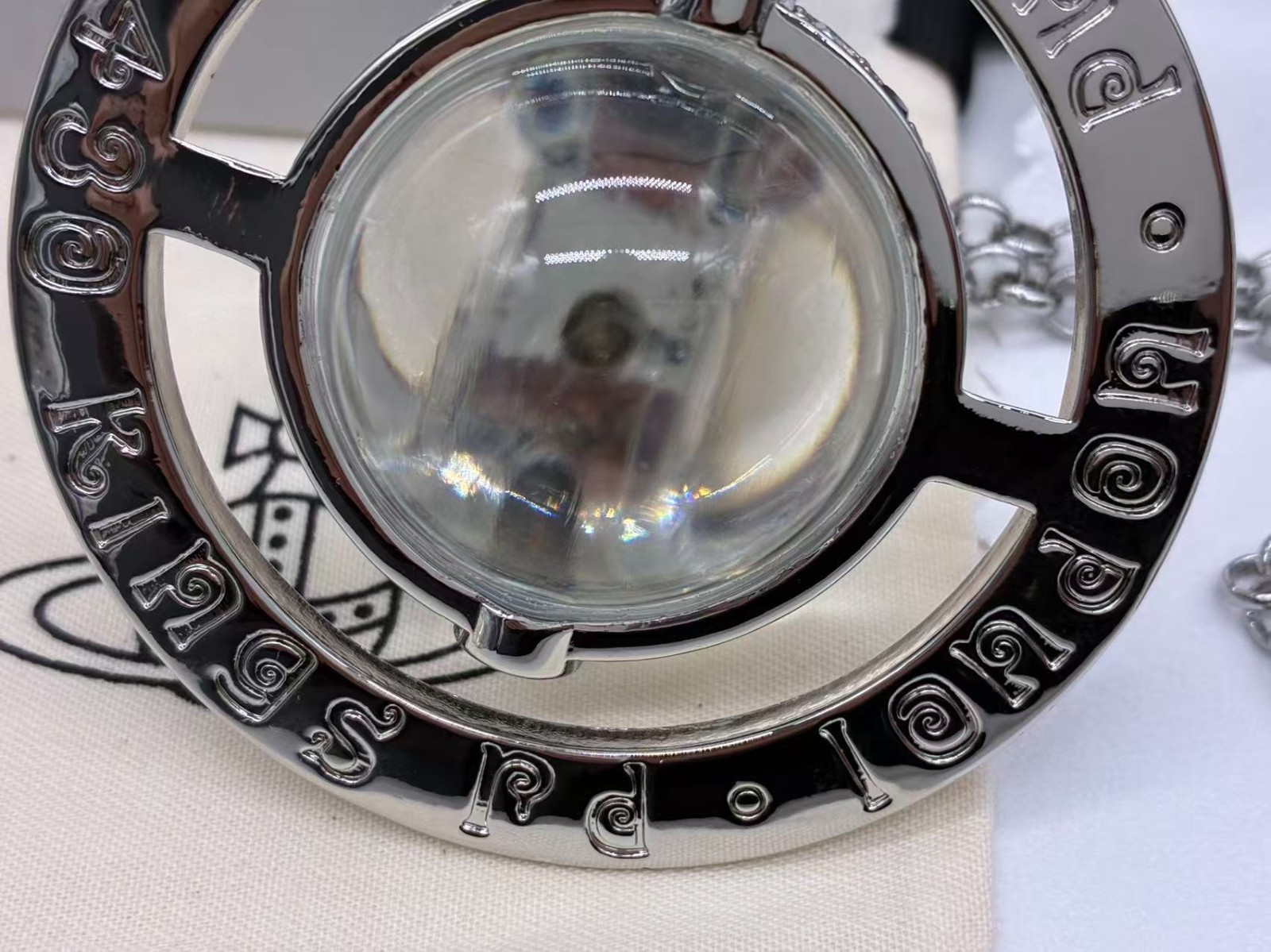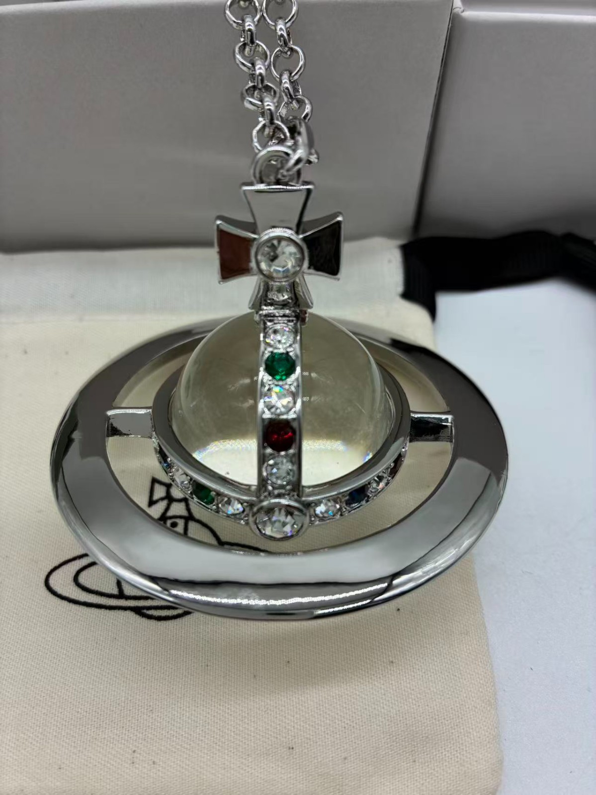 Came early was very happy but the seller did not reply to my questions on the item. This is infact a bootleg it’s not the real necklace but it is quite beautiful. It is about 2inches for the Saturns size and looks like the description in the photo. The packaging was simple it was just in bubble wrap and inside of it was the viv box with the necklace. For the value of it I would say to it’s worth it!