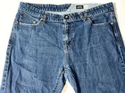 Volcom Solver Modern Straight Stretch Denim Navy Blue Jeans Pants ~ Men's Size 38. Measures: 18.5" flat across the front of the waist unstretched, 11" rise, 31.5" inseam, and 41.5" long from waist to bottom hem.