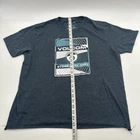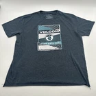 This is a men's Volcom T-Shirt in size Large, featuring a graphic print with a blue character logo on the front. The shirt has short sleeves, a crew neck, and a relaxed fit. It is gray in color and made of a blend of polyester and cotton, suitable for all seasons. The design theme is beach and classic, making it a versatile option for summer, fall, and spring wear. Check pictures for flaws and measurements