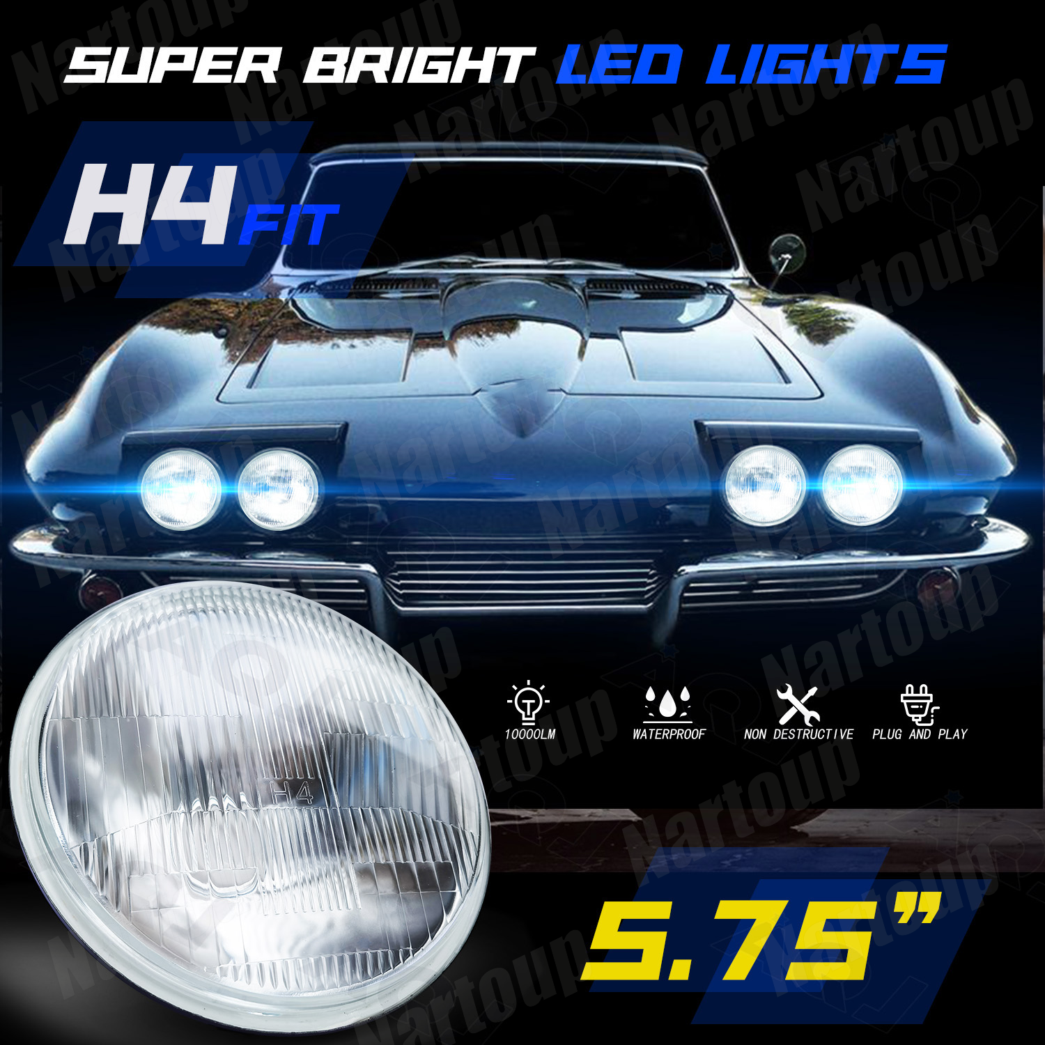 5-3/4"5.75 Round Stock Style H4 Conversion Headlights with Super Bright White LED Light Bulbs. Keep the Classic Look with Modern Light Brightness! Plug And Play! This listing is for a new set of 5 3/4" stock style glass lens - metal back headlight bulbs. This set includes (4) low/high beam headlights with high intensity LED light bulbs (no wiring or bucket modification needed). These have the original shaped prongs on the back so they will plug right into your original wiring harness plugs. These will fit any car or truck that has 4 round glass headlights. Will fit into stock buckets. Each bulb is 5 3/4 inches in diameter. These are glass and we will take extra care in packaging. DOT SAE approved Set Of 4 - 5-3/4" Stock Headlights w/ Led Bulbs Stock Style Glass Lens / Metal Backside 6000K High Intensity Led Bulbs (4) Low/High Beam Headlights Fits Directly Into Stock Buckets No Modifications Needed - Plug And Play Part Number Interchange: H5006 / H5001 Or 4000 / 5001 DOT / SAE Approved LED LIGHT BULB Specifications and Features: Bulb Size: 9003 / H4 / HB2 Application: Headlight High Beam And Low Beam LED replacement bulbs are engineered for superior performance, exceptional looks, and increased safety. 3570 CSP LED chip high power 100W per bulb Color Temperature: 6000K White Lumens: 6000 lumens per bulb,no blind zone Working Voltage: DC 9-32V ( Fit 12V,24V Vehicle ) No delay to light up, Faster on/off response time Lifespan: 50,000 working hours, stable quality, long service life Aluminum heat sink design,built-in automotive circuit to prevent electronic interference. The model is the same as factory light, no need to change car wire rute,just Plug and Play, NO modification required Energy saving, environmental protection, Stable performance, through strict test, Use safer driving in the car High quality Aluminum heat sink ensures proper temperature regulation. Lower Power Consumption than bulb. Vibration proof design. 50,000 Hour Lifespan Easy installation, Plug and Play, No modification required Material: ABS Housing, PC Lens Uses 55% less power than or HID bulbs 2 times brighter than stock bulbs OBC Error free operation Dramatically improves visibility at night Interchange: H5006 / H5001 or 4000 / 5001 Package Included: 4pcs 5-3/4" headlight Housing 4pcs H4 led Bulbs 4X H4/9003 to H13/9008 Connectors Cable Adapters Harness Note: Without mounting bracket, some models may need mounting bracket! After service Notification: If you are satisfied with our product and service please leave us a positive feedback,if there is any problem when you received the package,please feel free to contact us,we will be definitely give you a satisfying solution,when you choose the return reason .please choose the reason"i don't like it". by this option we will accept your return immediately and provide return label for full refund. the others reason to return will take both of us many troubles to handle. If you have any questions, please feel free to contact us, we are happy to answer them for you. Hope you will have a good shopping experience~