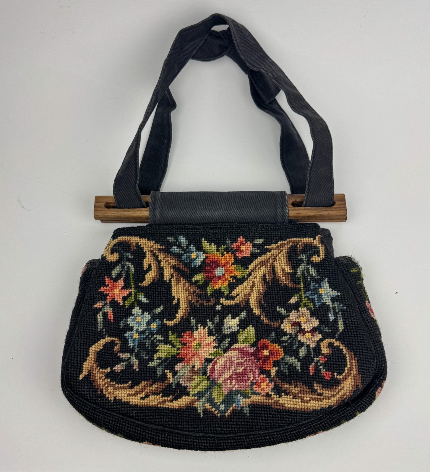 Brand: Unknown Measurements: 11" length, 8" height (strap is adjustable with a tie) Material: Needlepoint Tapestry, Wood Handles Decade: 1960's Color: Black/Multicolor Condition: The purse is in very good condition. There are no visible stain/rips/imperfections. Additional Notes: Due to the delicate nature of vintage/antique items, all items are non returnable and non refundable. All vintage items are pre-loved and have had a previous life. While we do try to list as many imperfections as possible, there may be additional very minimal signs of age/usual use. Straw/shear marks, small bubbles, rough edges, color potency, and variations are characteristics of the manufacturing process at the time and are not to be regarded as flaws. Colors on images may vary from screen to screen. Vintage items were not made with modern standards in mind. Mamma Mia LLC recommends vintage/antique items for display use only. If you decide to use them for additional purposes, you are doing so at your own risk as we cannot guarantee safety, durability, or longevity.