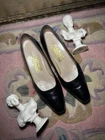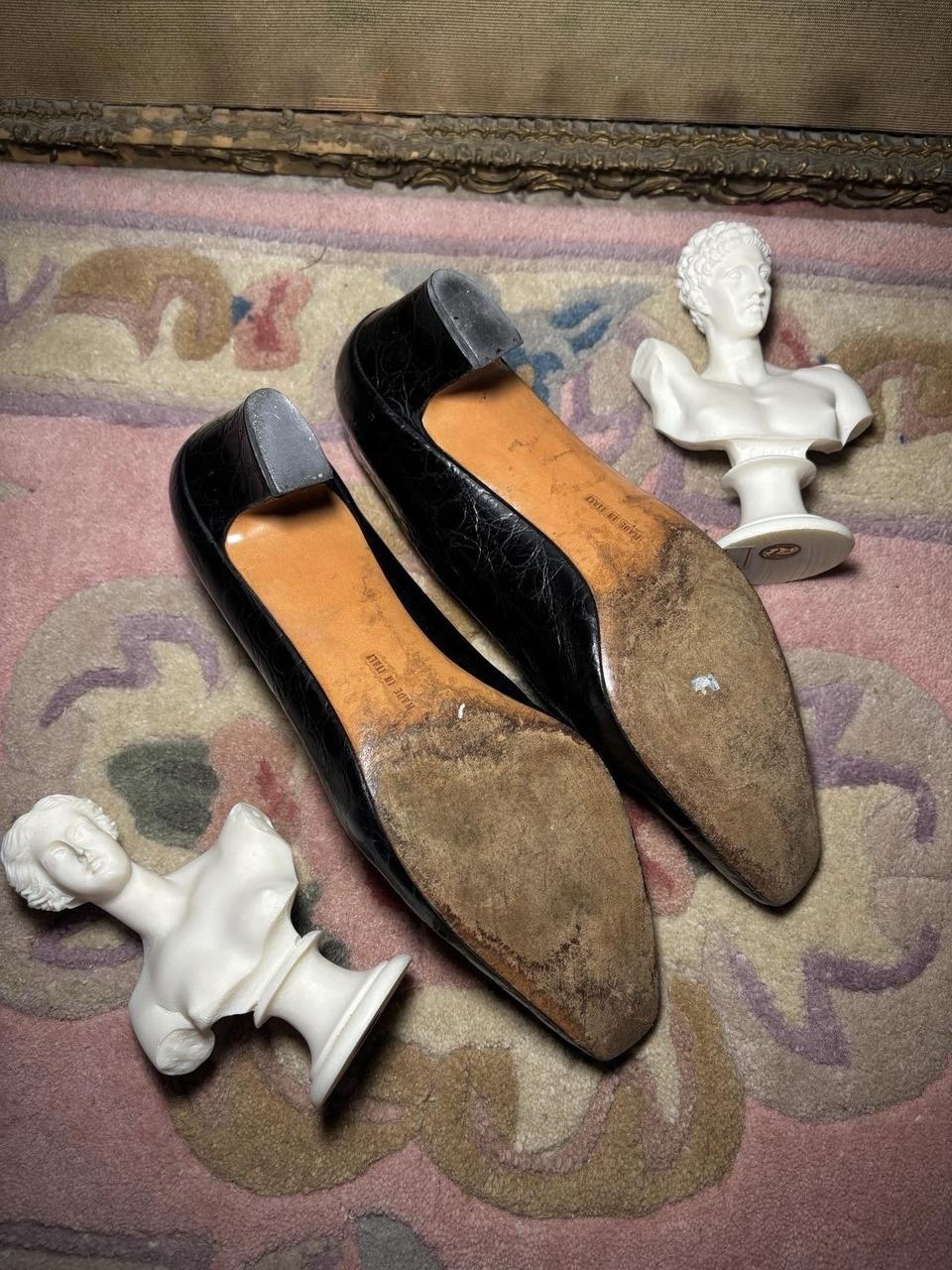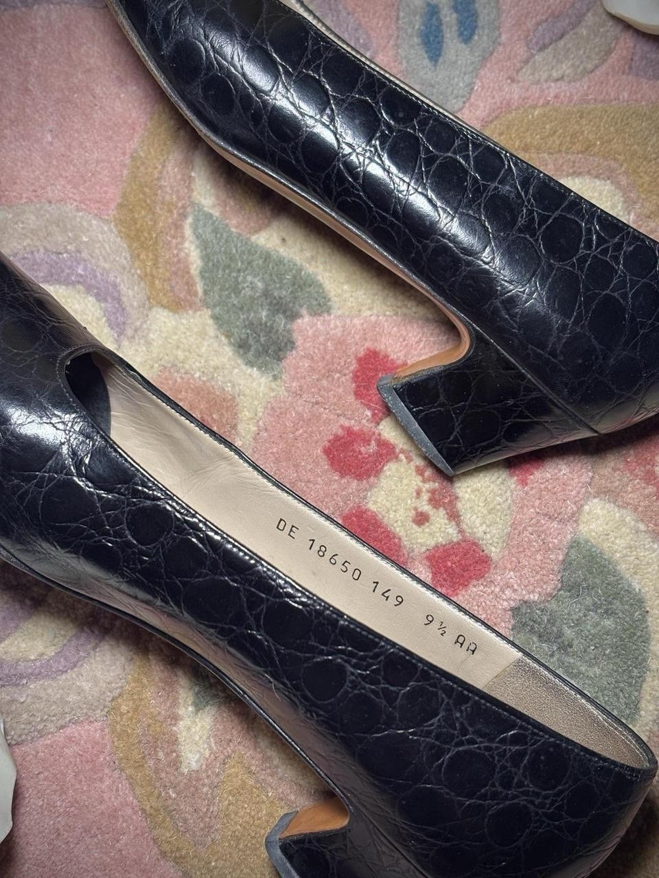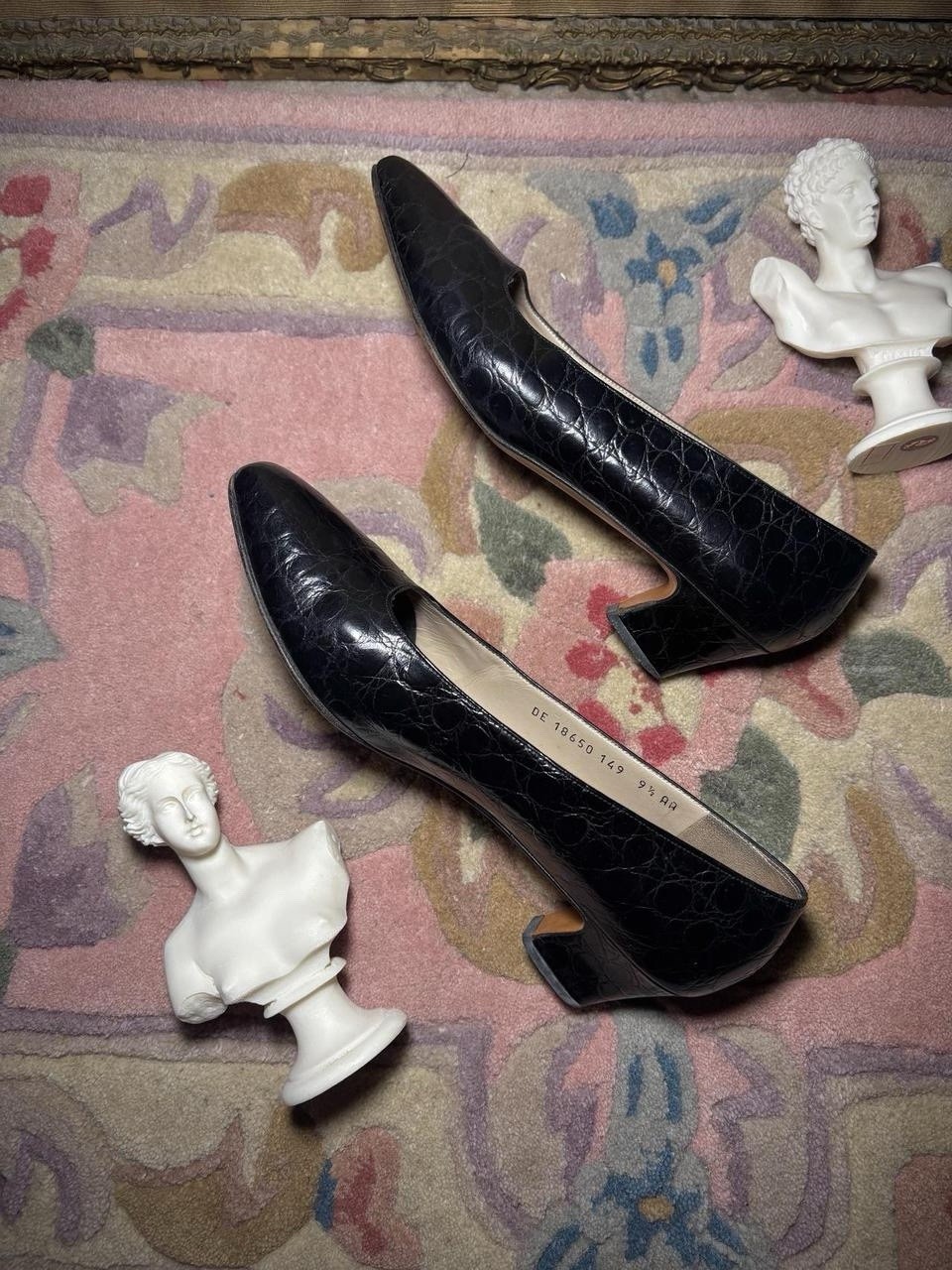 Vintage 1980s Salvatore Ferragamo Black Crocodile-Embossed Leather Heels, Size 9.5 ౨ৎ Size: 9.5 AA (narrow fit) ౨ৎ Heel height: 2” ౨ৎ Insole: 10.5” (but very narrow at the tip) ౨ৎ Widest width: 3” ౨ৎ Material: Genuine leather, crocodile-embossed texture ౨ৎ Made in Italy Classic and elegant, these vintage Salvatore Ferragamo heels feature a glossy crocodile-embossed leather upper with a sculpted, squared toe and low block heel. A timeless silhouette that pairs refinement with everyday wearability. The gold Ferragamo logo is stamped inside the insole, highlighting their Italian craftsmanship. Good vintage condition with moderate wear to soles and light creasing consistent with age and use. Leather remains supple and glossy, and heels are sturdy. #Ferragamo #vintageshoes #crocodileleather #designerheel B3