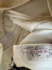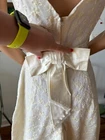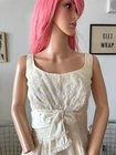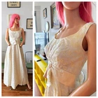 Details: gorgeous designer boutique wedding or party dress scooped neck, back metal zipper full bustle train in the back- tons of fabric white with off white/ivory/buttery floral brocade white silk ribbon details, some fringed flaws: great vintage condition, no holes or stains; note pictured some discoloration on the back bow Measurements: taken with the garment lying flat, please double. shoulder to shoulder: armpit to armpit: 16" waist: 12.5" hip (measured 6" below waist): length: 52" inseam: rise: please be sure to check measurements carefully. The size listed in the title is a general idea, and should not be used alone to decide fit.