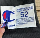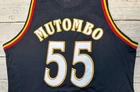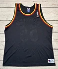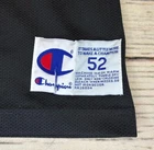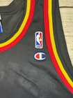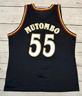 This is a vintage 90s Champion jersey of Dikembe Mutombo from the Atlanta Hawks, featuring the number 55. The jersey is in size 52 and is black in color. It is a men's basketball jersey from the National Basketball Association (NBA). Missing front label and the label is teared. Check pictures for condition and measurements.