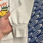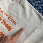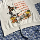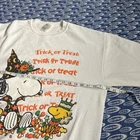 The product is a vintage 90's Peanuts Snoopy and Woodstock Trick or Treat Halloween sweatshirt in XL size. This white pullover sweatshirt features the iconic Snoopy character from the Peanuts brand, perfect for fans of 90s nostalgia. Made in the USA, this sweatshirt is a unique and fun addition to any man's wardrobe, ideal for adding a touch of retro style to their outfit. Staining throughout crewneck on sleeves and front.