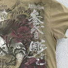 The product is a vintage Affliction shirt featuring a graphic print of heroes from the Suikoden series by Horiyoshi III. The shirt has a crew neck, short sleeves, and a regular fit, making it suitable for everyday wear. The green color and grunge, tattoo, and gothic themes add a unique and edgy touch to the design. This shirt is a statement piece for fans of the Suikoden series and those who appreciate a blend of graphic design and streetwear fashion. No holes or stains See pictures for pictured measurements compare with your favorite garment and ask questions if you have any Add to your collection today Browse my other items I can combine shipping