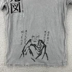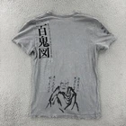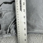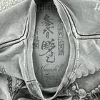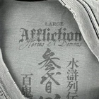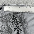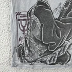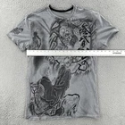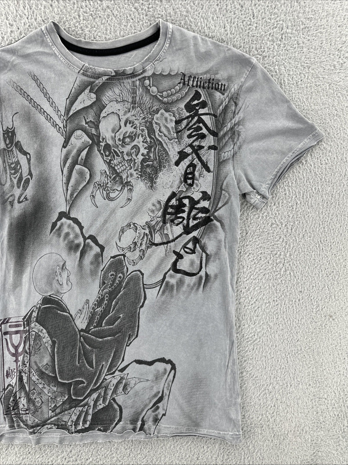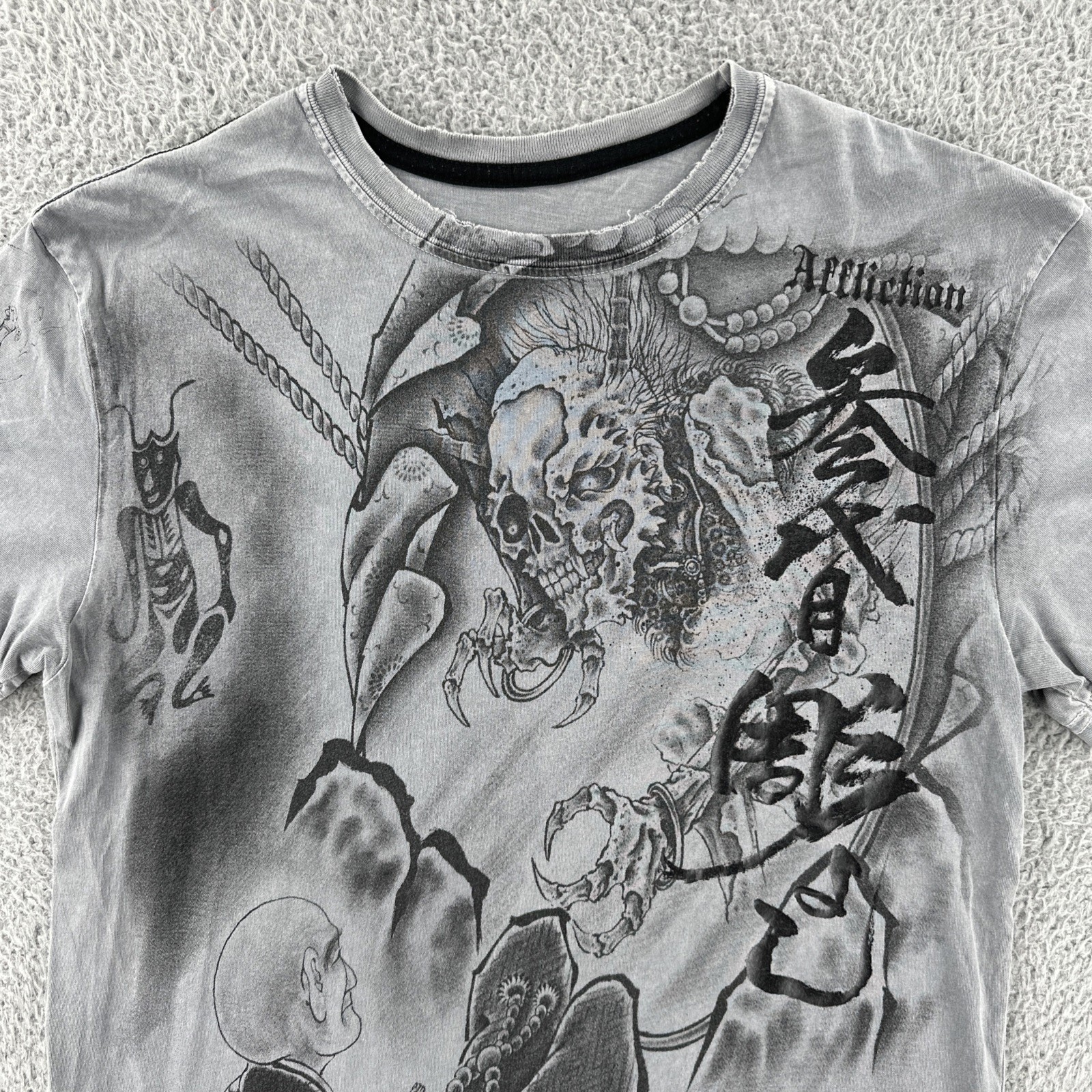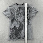 The product is a vintage Affliction shirt designed by Horiyoshi III, featuring a graphic print with a hero character theme. The shirt is in size Large, with a crew neck and short sleeves, in a gray color with an all-over print. It has a regular fit and is part of the Men's Department. The shirt's design includes elements of grunge, skulls, and tattoos, reflecting the brand's edgy aesthetic. No holes or stains See pictures for pictured measurements compare with your favorite garment and ask questions if you have any Add to your collection today Browse my other items I can combine shipping