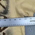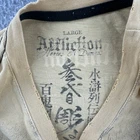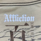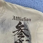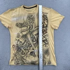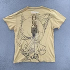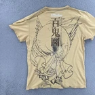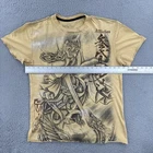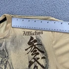 This product is a vintage Affliction men's large T-shirt featuring a graphic print with a hero theme by Horiyoshi III. The shirt has a yellow color with a crew neckline and short sleeves, making it a stylish addition for those interested in designer grunge and gothic styles. With its regular fit and iconic brand, this shirt is sure to make a statement for any man looking to add a unique piece to their collection. No holes or stains See pictures for pictured measurements compare with your favorite garment and ask questions if you have any Add to your collection today Browse my other items I can combine shipping