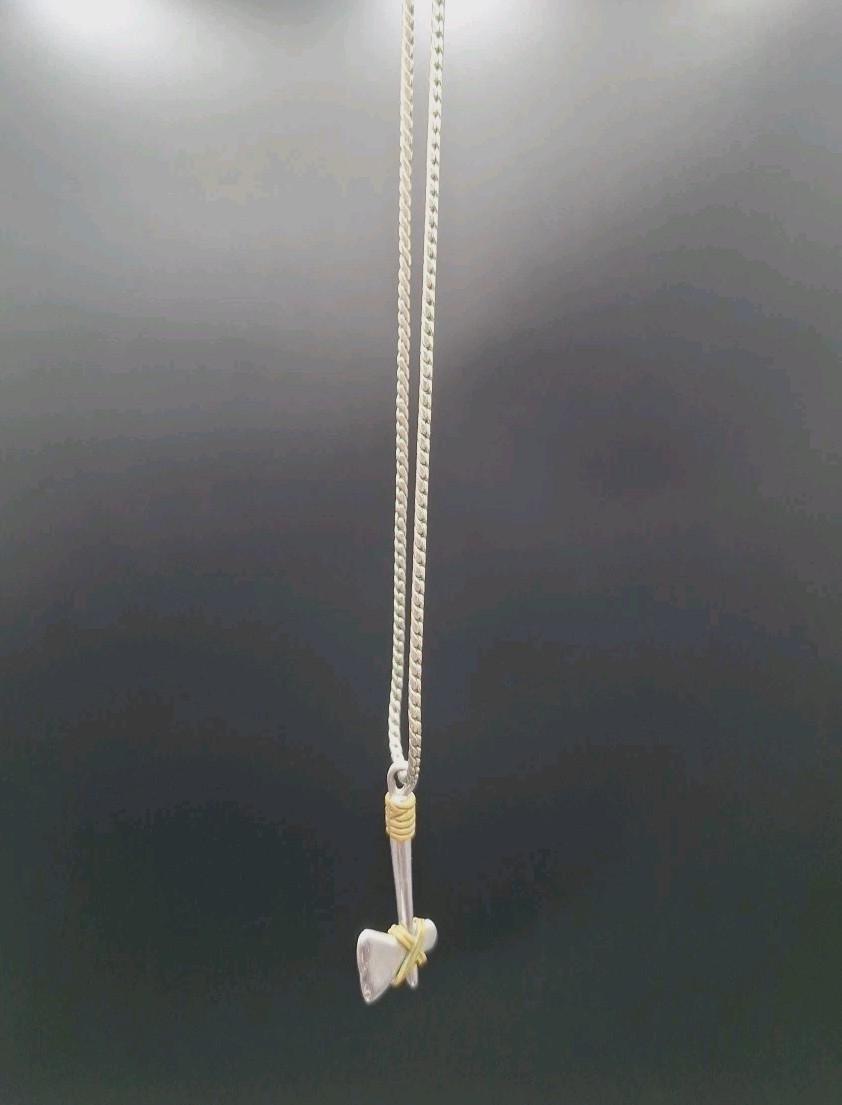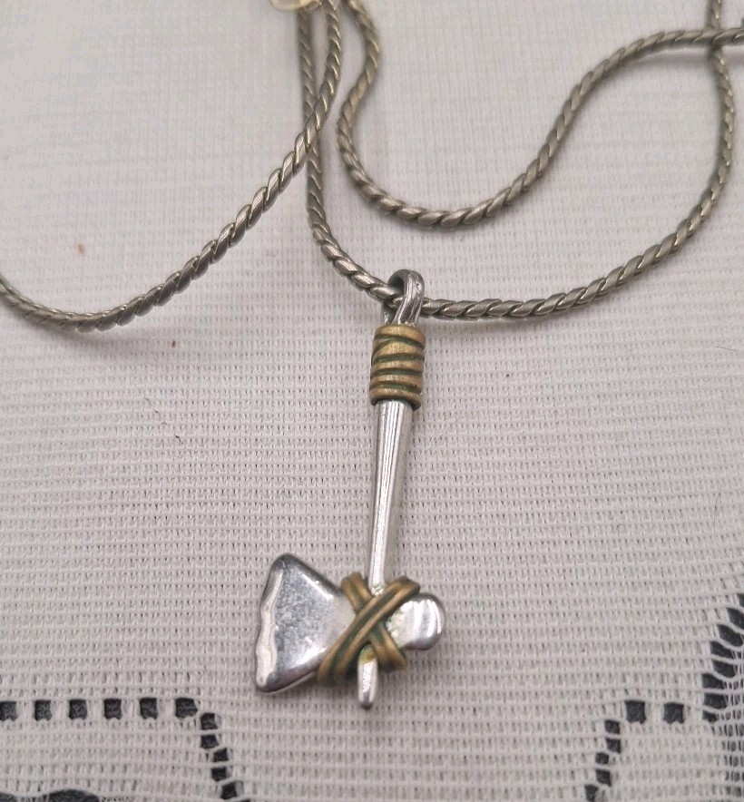 This vintage Viking or Native American Tomahawk-Axe Necklace is a unique and stylish piece made of sterling silver. The pendant features an axe or tomahawk hatchet design, adding a touch of ethnic and regional flair to any outfit. The necklace is signed as "No," and it is perfect for special occasions such as Christmas, graduation, weddings, anniversaries, and birthdays. Made with a silver toned chain, this pendant charm necklace is a beautiful and meaningful addition to any jewelry collection.