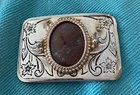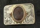 Vtg Belt Buckle Silver & Gold Tone Metal Polished Agate Stone Western Rodeo
