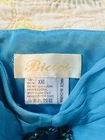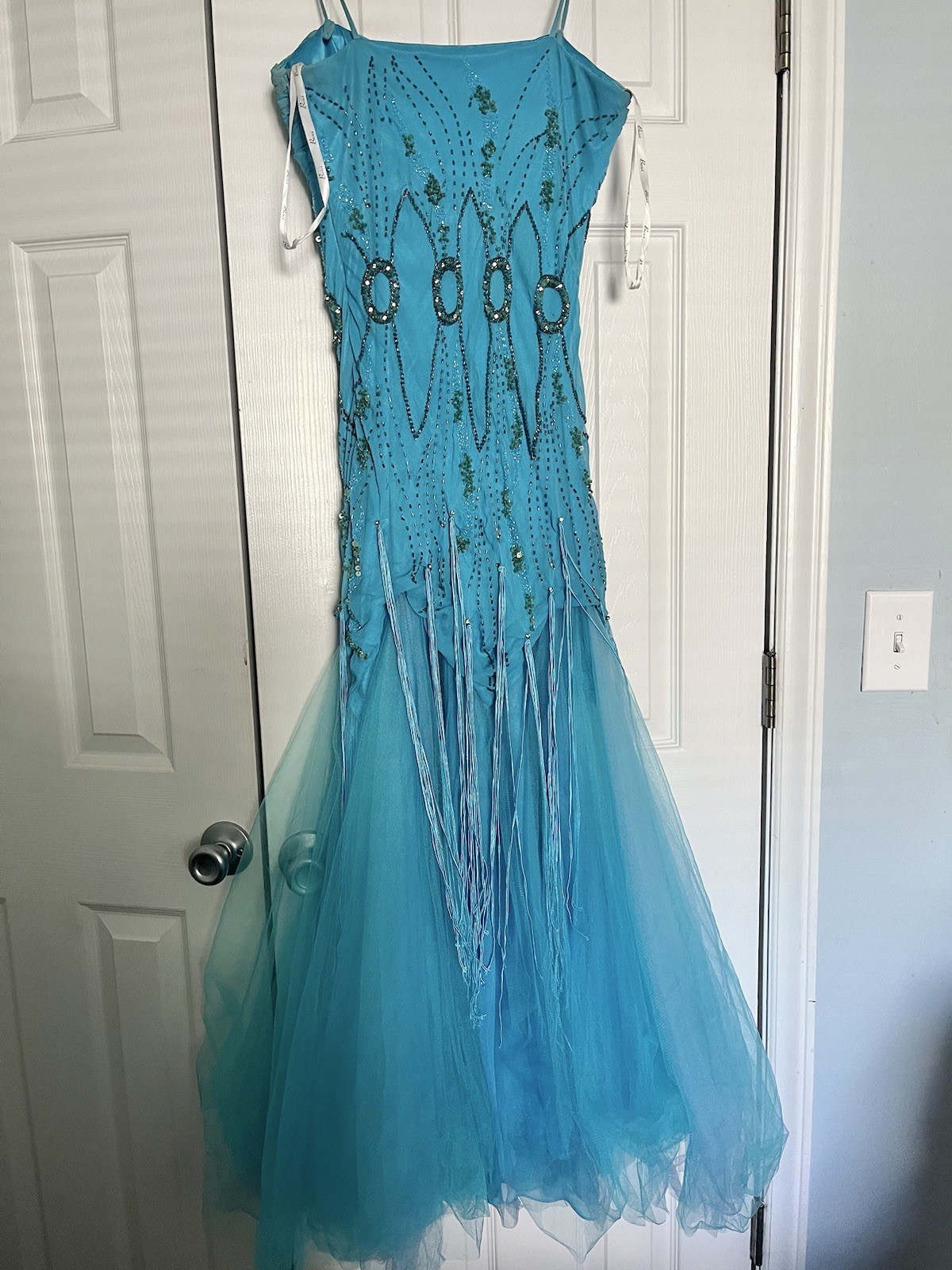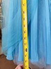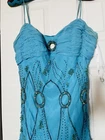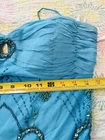 This vintage blue silk prom dress features a floral pattern with whimsical fairy character accents, making it an enchanted and enchanting choice for formal occasions. The dress has a sweetheart neckline, sleeveless design with strappy sleeves, and is adorned with beads, rhinestones, and sequins for a touch of sparkle. With a long length, fit and flare style, and maxi silhouette, this dress is perfect for princess-themed events in any season. The dress also includes features such as a backless design, lined interior, side slit, drop waist, asymmetric hem, corset closure, and sheer chiffon fabric for a romantic and ethereal look. Xxl is listed on tag and measurements are included in photos but should equate most closely with US 6. Some missing beads in the designs - so check Closeups but nothing drastic. Spot clean only 16” pit to pit 14” waist 18” hips 50” long