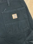 The product is a pair of vintage Carhartt B11 Black Original Dungaree Canvas Carpenter Pants in size 40x30. These workwear pants are designed for outdoor use, with a durable canvas material and original fit leg style. The black color and limited edition design make them a stylish and practical choice for rugged work environments. Made in the United States as part of the Union Made product line, these pants are perfect for those looking for quality, American-made workwear with a classic outdoor theme.