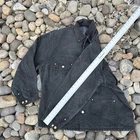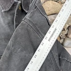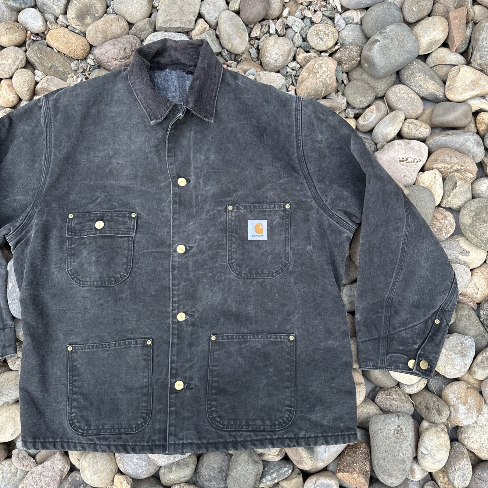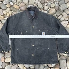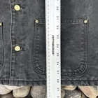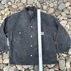 The product is a vintage Carhartt black chore jacket in adult size XL. It features a blanket-lined interior for added warmth, a corduroy collar for added durability, and a button closure for easy wear. This workwear jacket is designed for all seasons, making it a versatile and practical option for any outdoor or work activity. Made of cotton with a solid pattern, this jacket combines style and functionality with the trusted Carhartt brand.
