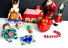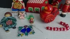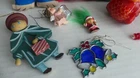 Lot of Vtg Christmas Ornaments Santas on rocking chair, Miniature Troll, House of Hatten House, Hallmark Bird and thimble angel, stained glass Bells Clean. Nice vintage condition