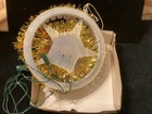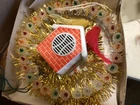 PLEASE NOTE: Photos, it looks like all the green bulbs do not work, BUT THEY DO. Apparently, when I shot the photo, because they were flashing, the green bulbs just happened to be in the non-lit flash mode. I assure you, they do work. This very unique, round, tinsel-embellished tree topper is very unique and rare. I have not found one anywhere on the Internet. I have included a little video with the photos. In the center is a little “brick” house speaker that plays chirping bird sounds, surrounded by 30 miniature lights. There are two flocked birds sitting on the roof of the house. The item comes with its original box. The box does have some damage to it. Please see photos. Everything on this item works well, and all the lights work. I just noticed that three of the lights which were probably initially different colors, apparently have been replaced with clear lights. This, of course, could be changed to suit your wishes. My guess is that this item was made in the 70s, possibly even mid to late 60s, but there is no date on it. Please ask any questions you may have, as I do not accept returns. Thanks for looking!!
