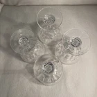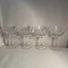 This set includes four vintage clear crystal champagne or sherbet glasses with a large thumbprint pattern. The round glasses are 4 inches in diameter and 5.5 inches in height, weighing a total of 1.13 lbs. They feature a mid-century modern style and are decorative in design, suitable for all occasions. The brand is Crystal Clear, and they are original pieces made of crystal, adding a touch of elegance to any tabletop setting. Excellent condition. No chips or cracks.