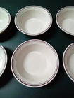 This is a set of 6 vintage Corning Corelle Abundance 6 3/4" cereal soup bowls with blue and red stripes. These round bowls are made of glass and are microwave safe, featuring a glossy finish. The bowls are beige sandstone with blue and dark red stripes near the rims. They are part of the Corelle product line and are break-resistant, making them ideal for everyday use. Made in the United States during the late 20th century, these bowls are perfect for all occasions and are a charming addition to any table setting. The bowls are in used condition with no chips or cracks. They have some signs of light wear from previous use. See photos.