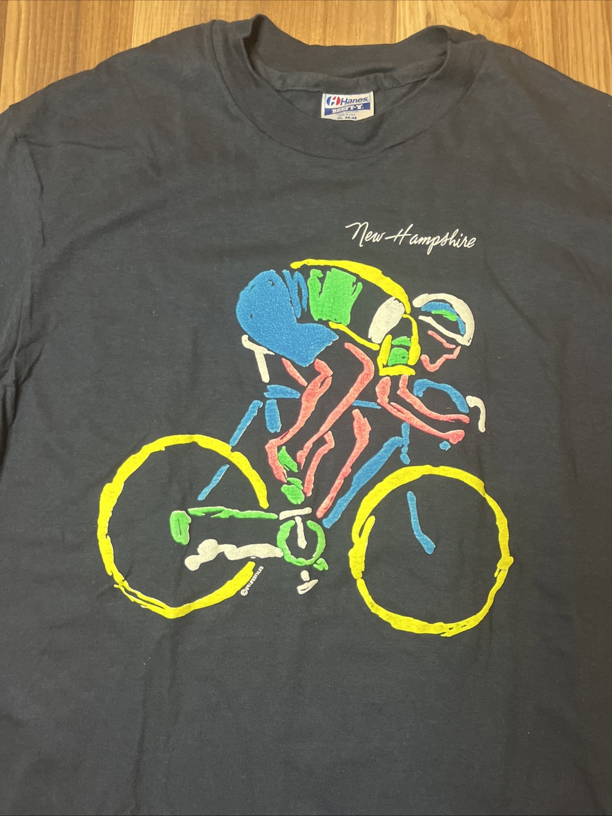 This vintage New Hampshire cycling bicycle t-shirt from 1989 features a graphic print of a road bike on the front and back, with a single stitch detail. Made of cotton in a classic black color, this XL shirt has a crew neck and short sleeves, suitable for year-round wear. The 80s theme and vintage style make it a unique addition to any cyclist's wardrobe, with a regular fit and American-made quality from the Hanes brand. Perfect for winter, summer, fall, or spring, this shirt is a must-have for biking enthusiasts looking for a piece of retro cycling fashion.