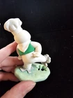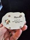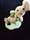 This is a vintage 1997 Danbury Mint figurine featuring the Pillsbury Doughboy for the month of March, specifically designed for St. Patrick's Day. The small ceramic and porcelain figurine is painted in Irish green color, part of a Monthly Holiday Calendar collection. This retired collectible showcases the iconic baking and cooking character in an American style, perfect for Pillsbury Doughboy enthusiasts. It's 3 inches tall and 2 inches wide