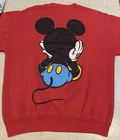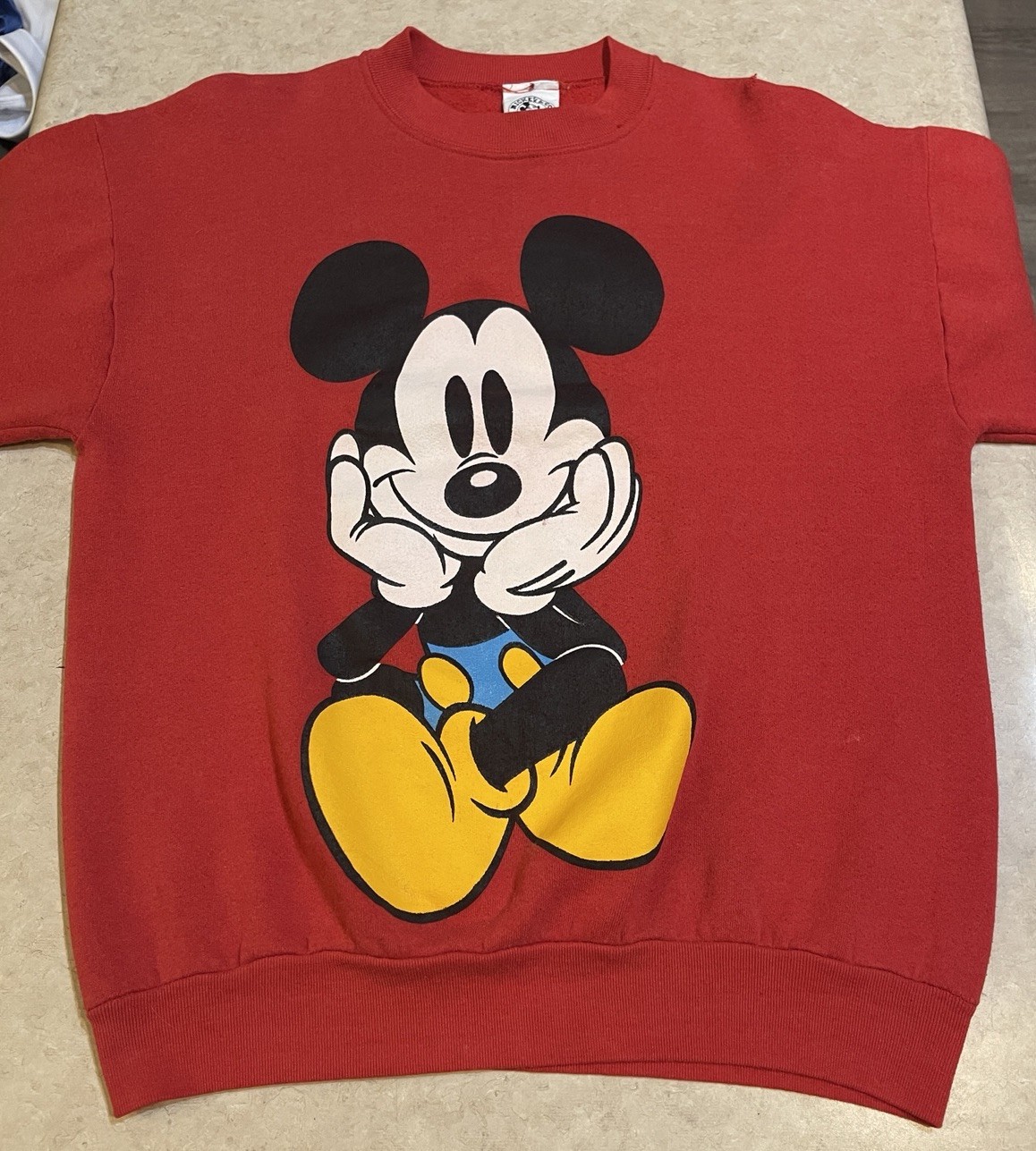 The product is a vintage Disney Mickey Mouse double-sided red crewneck sweatshirt from the 1990s. Made of cotton knit fabric, this pullover sweatshirt features a crew neck and long sleeves, making it perfect for fall, winter, and spring seasons. The graphic print showcases the iconic Mickey Mouse logo on both sides, representing themes such as hipster, USA, animals, and classic cartoon characters. This regular fit sweatshirt is machine washable and is part of the Mickey & Co. product line by Disney, ideal for men who appreciate retro 90s style and Disney nostalgia. This crewneck sweatshirt is in good preowned condition with some visible signs of wear such as on the shoulder, and some wear on one of the sleeves. Please see ALL photos for a better idea on condition, any measurements, or details to the sweatshirt.