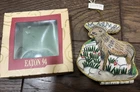 This vintage EATON embroidered reindeer Christmas ornament from 1994 is a must-have for any collector. The intricate details on the boxing-themed ornament make it a unique addition to your collection. The ornament measures 4.25 inches and comes in its original box. The set includes one ornament and is an original, licensed reproduction. The reindeer's shape and the embroidered features make it a perfect addition to your holiday and seasonal ornament collection. This collectible item is a great way to add a touch of vintage charm to your decor. Preowned in good condition other than a few loose strings along the edge and also some light discoloration of the white satin base. Could be from handling, but there’s also a spot where the glue has soaked through the material. Basically in great condition for its age. Please see close-up pictures for details.