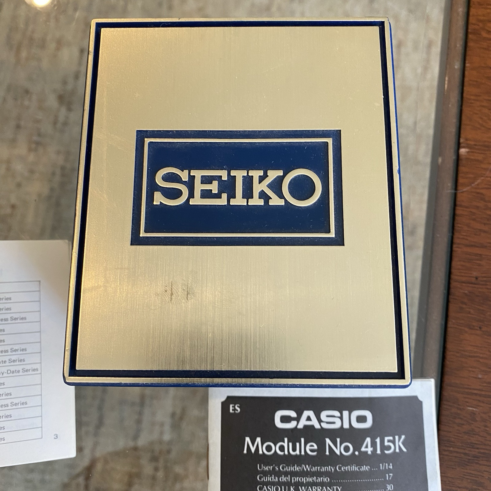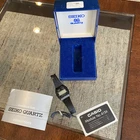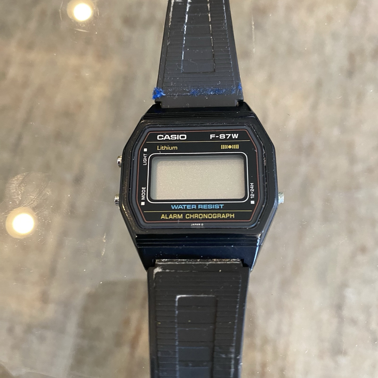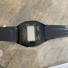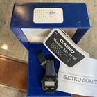 This is a vintage Casio F-87W wristwatch from the early 1980s. It features a black plastic case and original band, the band is broken with a digital LCD display. The watch has a quartz (battery) movement and probably needs a battery to be in good working condition. It comes with its original box and manual, and is a rare find for collectors. The watch has an alarm and chronograph functions, as well as a light feature. It is a men's watch with a two-piece strap and a vintage style. I believe the back of the watch had a sticker on it that can probably be cleaned off. I haven’t tried to replace battery or anything selling as is. With original hardcase box and manual papers what you see in the photos is what you get, open to offers.
