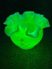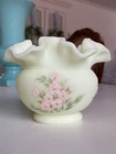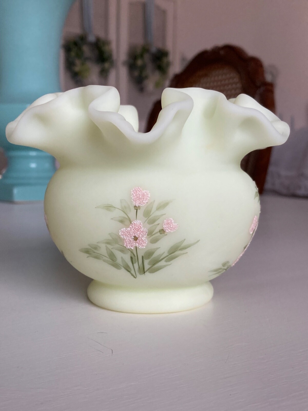 Vintage Fenton uranium custard glass in a very soft yellow with delicate hand painted pink blossoms that look “sugared” :-) It is a ruffled rose bowl with a faint embossed oval Fenton stamp on the bottom along with a signature of what looks like J Chapman. Such a pretty vase! Please email us with any questions and please check our Ebay store, Hooked-On-Vintage, for more great vintage items. We combine ship!