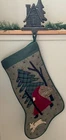 Beautiful large size vintage stocking by House of Hatten. Artist: Gerry Kimmel Woodsy look is the perfect addition to cabin or home decor. Santa Claus is hiking through the woods, with his sack, and carrying a walking stick. Cute little rabbit nearby. Plaid pine tree (wouldn't that be cool in real life, a plaid pine tree?!). The fabrics used in the applique are adorable, as well. Approx measurements: Top to heel, 17"Heel to toe, 12". Items such as stocking hangers, etc. are used as props only. Stocking in excellent condition. Smoke free home. Thank you for looking.