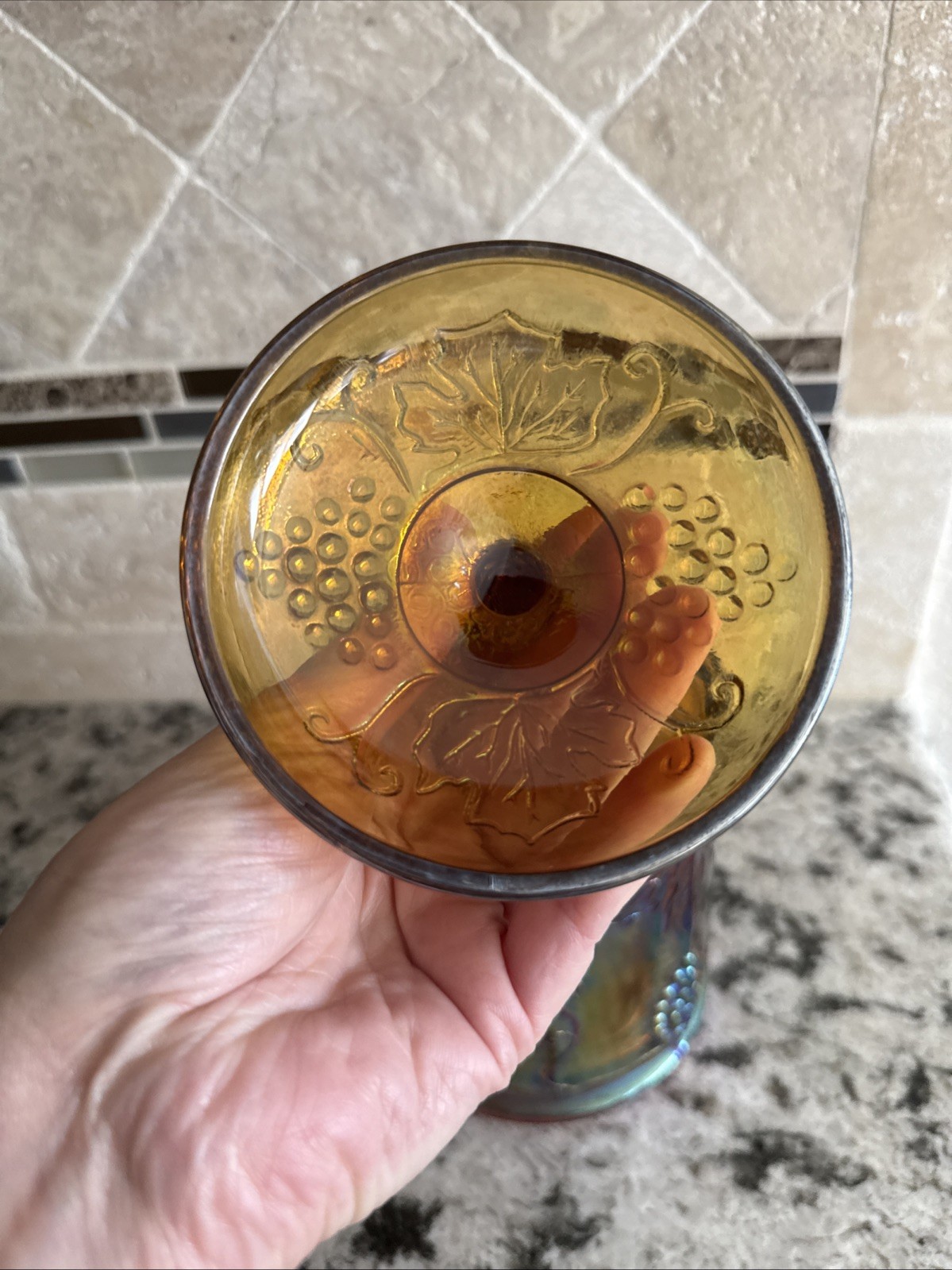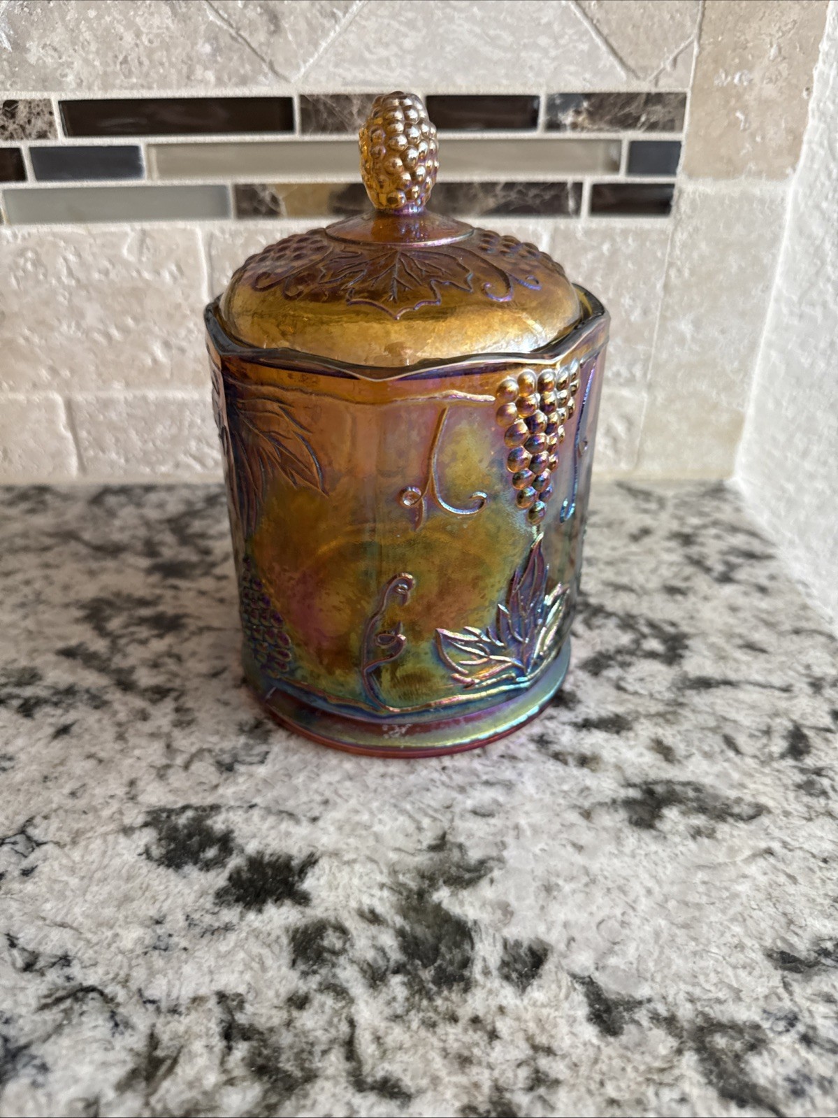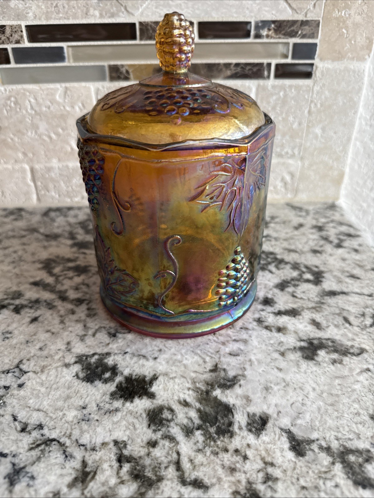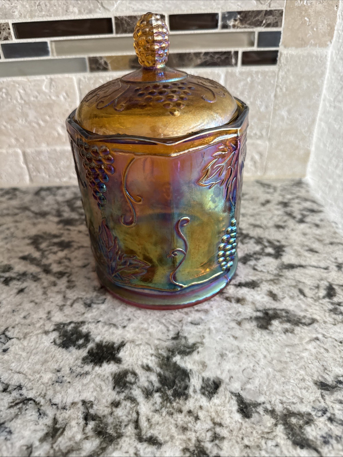 This vintage Indiana Glass Co. candy jar features a charming gold carnival harvest design with grapes and grape vines. Standing at 7 inches tall, this cylindrical jar is made of orange glass and comes with a lid for easy storage. The retro style and multipurpose use make it a unique and decorative addition to any kitchen or dining space. Easy to clean and maintain, this jar offers both functionality and aesthetic appeal for a touch of nostalgia in your home.