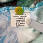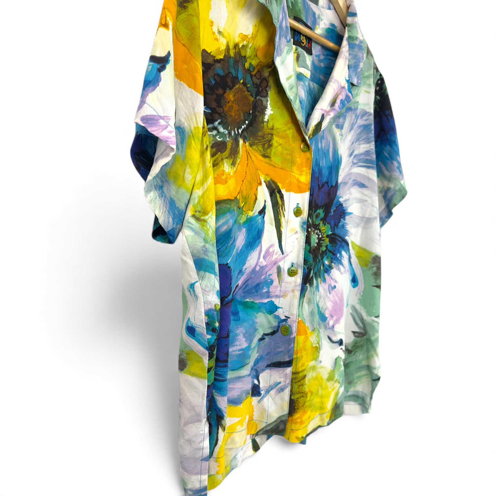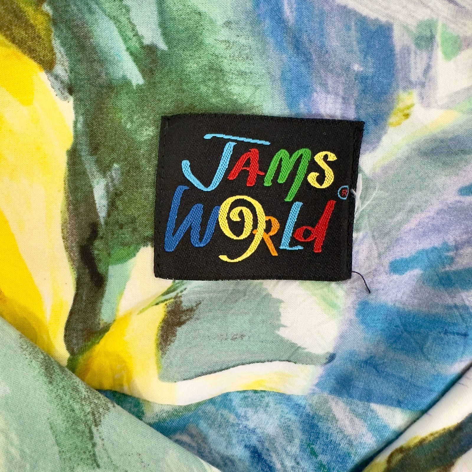 Step into effortless resort luxury with this stunning vintage Jams World “Belle Fleur” button-front shirt , crafted in Hawaii and designed with their signature painterly floral artwork. Produced in the gorgeous W624-BEUR Belle Fleur print, this piece showcases oversized tropical flowers in vivid tones of blue, yellow, teal, green, and lavender , creating a breezy, sunlit palette perfect for warm destinations and coastal living. Cut from lightweight 100% rayon , it drapes beautifully with a soft, fluid feel — the ideal fabric for travel, beach days, resort evenings, or elevated casual wear. Jams World pieces are known for their hand-painted art prints, collectible styles, and vibrant island aesthetic. Details & Features Brand: Jams World Style: Belle Fleur short-sleeve button shirt Size: 2XL (Generous, relaxed fit) Fabric: 100% Rayon – lightweight, airy, ideal for warm weather Origin: Made in Hawaii, USA Print: W624-BEUR Belle Fleur (copyrighted art print) Colors: Blue, yellow, green, lavender, teal, white Details: Button front, camp collar, signature Jams World art print. Collectible art shirt Vibe: Resort wear · tropical · coastal · vacation style Why You'll Love It This shirt captures pure sunshine energy. The vibrant florals and hand-painted aesthetic offer a standout island look, while the soft rayon fabric keeps you cool and comfortable. Whether worn open over a tank, paired with linen pants, or styled for a beach vacation, it radiates effortless resort elegance. Measurements (Laid Flat) Shoulder: ~17.75" Bust: ~24.5" Sleeve: ~8" Length: ~23" Hem: ~24"