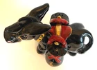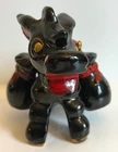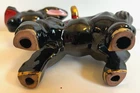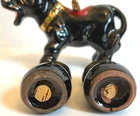 RARE VINTAGE MID-CENTURY BLACK DONKEY WITH MONEY BAG SHAKERS This highly collectible and fun ceramic set is a fantastic piece of mid-century novelty decor (Kitsch) likely produced in Japan for export in the 1950s or 1960s. The set features a charming, glossy black donkey/mule figure carrying two detachable money sacks that function as shakers. Key Features: Figurine: Glossy black donkey/burro with gold detailing on the collar and saddle, and pink inner ears/nostrils. It has a hole and hook on its back to hold the shakers. Shakers: The two small, black, sack-shaped shakers feature a red bow and a gold currency symbol : one has a Dollar Sign ($) and the other has a Pound Sterling sign (£) (or possibly a Peso/Franc symbol), adding an international element. These hang from the donkey's saddle. Style: Anthropomorphic, Kitsch, Novelty Kitchenware. Origin: Made in Japan (consistent with this style and era). Dimensions: Overall Height: Approximately 5 inches tall Overall Width/Length: Approximately 5 inches wide Condition: very nice vintage condition. The high-gloss glaze is intact, and the gold and red painted details are vibrant. This piece shows very minimal wear for its age. This adorable piece is a must-have for collectors of vintage animal shakers, souvenir ceramics, or retro kitchen decor! I will pack with care and get it to you ASAP Thanks for looking !