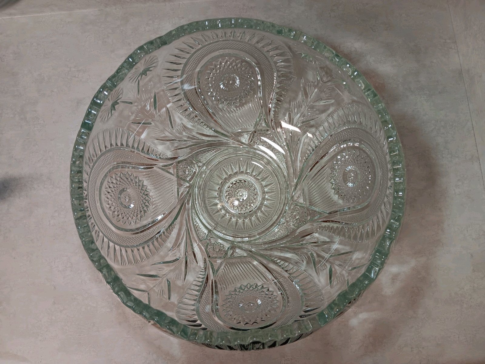 Excellent Condition! However, this most likely contains LEAD and should be used for decorative purposes only. The L.E. Smith Glass Company made punch bowls in the Pinwheel & Stars pattern, also known as the Slewed Horseshoe pattern, from the 1940s to the 1980s. The company went bankrupt in the 2000's making this a discontinued piece. It is very heavy, in great condition, and an almost complete set. The original set came with 18 cups, and this has 12. The Punch Bowl fits perfectly into the platter! Due to the weight of the set and not wanting this gorgeous collectors piece to be damaged in any way, it will be a local pickup only. Thank you for understanding! This Set Comes with: -12 Cups (Height: 2.5" Diameter: 3") -Punch Bowl (Height: 7.5" Diameter: 13.25" ) -Platter (Diameter: almost 22") -Plastic Ladle (Length: 14")