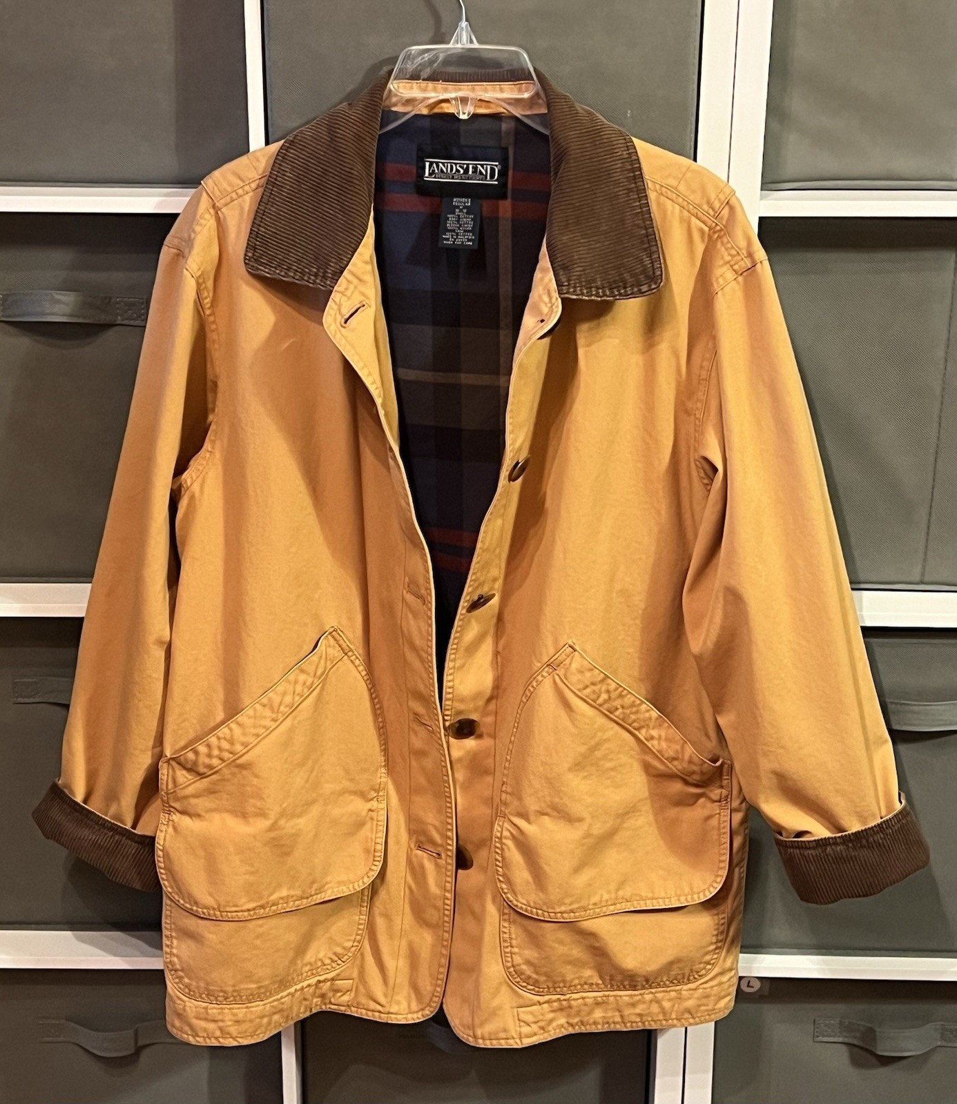 Vtg Lands End Women Regular Chore Jacket Barn Coat Canvas Plaid Lined Camel M 10-12. Condition is Pre-owned there are no holes or stains. The measurements pit to pit 23” drop sleeve 23” back collar to hem 29” Shipped with USPS Ground Advantage.