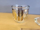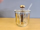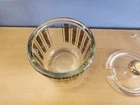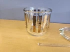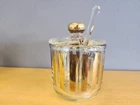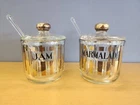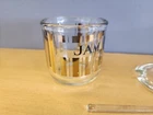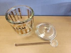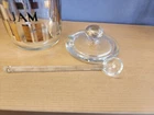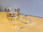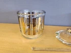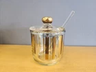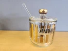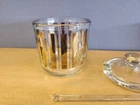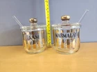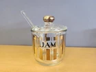 From the 1950s About this item Gorgeous and unique little pair of MCM gold accented jars, labeled "Jam" and "Marmalade". These vintage Culver jars include their lids and have a little notch to hold serving spoons (Included!!). The jars are clear glass with black and gold details. This detailing is mostly intact, with some fading with age as shown in photos. These jars make a perfect conversation piece and can be used for their intended purpose or display. Dimensions: 4" tall x 3" dia. All vintage items are described to the best of my ability. No vintage item is perfect. Please don't hesitate to ask questions prior to purchase