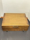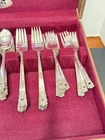 This mid century modern danish influence sweet has 77 pieces, missing 1 salad fork. The handle pattern is Scandanavia and the finish is glossy. The set comes with a walnut wood tone case with a tray for easy storage and transport. Large rare serving set. Discontinued in 1970. Includes three original pamphlet from when it was purchased, though it's not inn great shape. 12 knives 12 dinner forks 11 salad forks 24 teaspoons 12 for dinner, 12 for dessert 12 oval soup spoons 6 piece hostess/completer set Please feel free to contact me with any questions you have