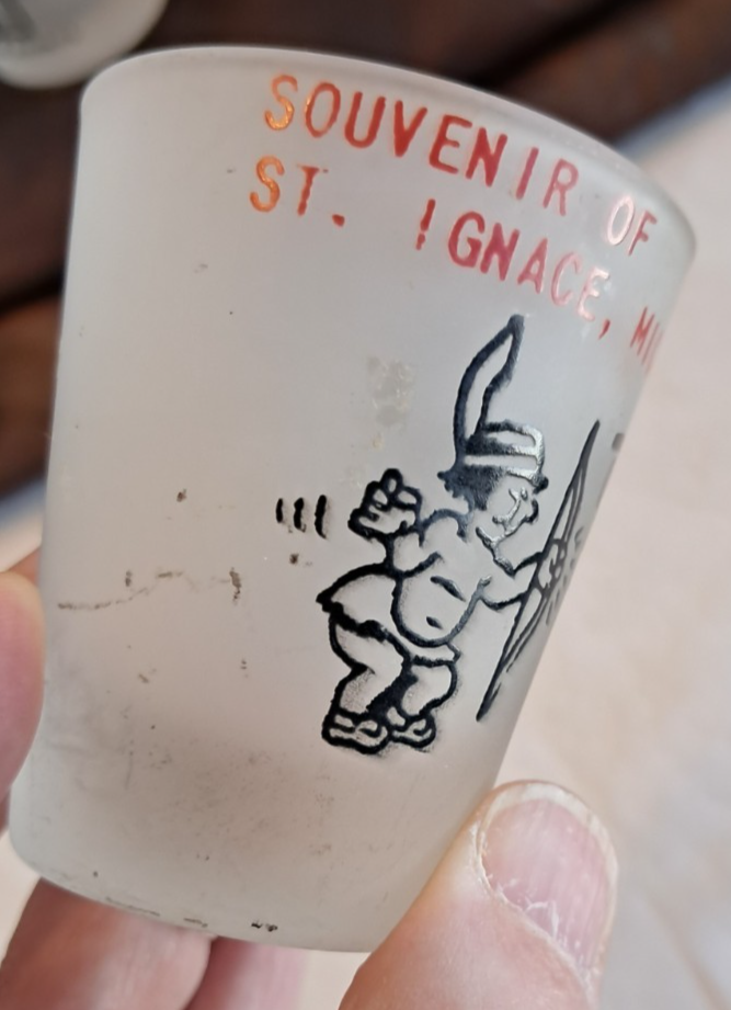 🥃 RARE Vtg 2pc Shot Glass LOT Frosted MCM: Confirmed Anchor Hocking & Hazel-Atlas Comparison Set This is a unique and highly collectible lot of two frosted glass shot glasses from the Mid-Century Modern (MCM) era (1950s/60s). This set is a fantastic collector's piece, featuring an authentic example from each of the two major American novelty glass manufacturers! LOT DETAILS (Confirmed Marks) Glass 1: Anchor Hocking Souvenir Glass (Small) Manufacturer: Anchor Hocking Glass Corporation . Authenticated by the clear "H over Anchor" embossed mark on the base. Design: St. Ignace, Mich. Souvenir Glass featuring a vintage, stylized graphic of a figure with a bow and arrow. Glass 2: Hazel-Atlas "Say When!" Novelty Measure Glass (Large) Manufacturer: Hazel-Atlas Glass Company (HA) . Authenticated by the clear "H over A" embossed mark on the base. Design: The classic novelty measuring glass featuring humorous fill lines: 0 OZ. FOR RABBITS, 3 OZ. FOR PIGS , and the slogan "SAY WHEN!" CONDITION & FEATURES Value: The rarity of finding an authenticated, mixed-manufacturer lot like this is high, making it a desirable collector's comparison set. Style: Mid-Century Modern (MCM) novelty barware, featuring durable frosted (Satin) glass with clear, vibrant graphics. Condition: Excellent vintage condition. Graphics are clear and intact, and the glass shows minimal wear for its age. No chips or cracks. Size Note: These are two distinct pieces of differing sizes, offered together as an authenticated comparison lot. Notice: Items are protected in poly bags/plastic totes. However, we use recycled packing and shipping materials that may be stored near alternative heating, causing them to carry a faint wood or propane scent.