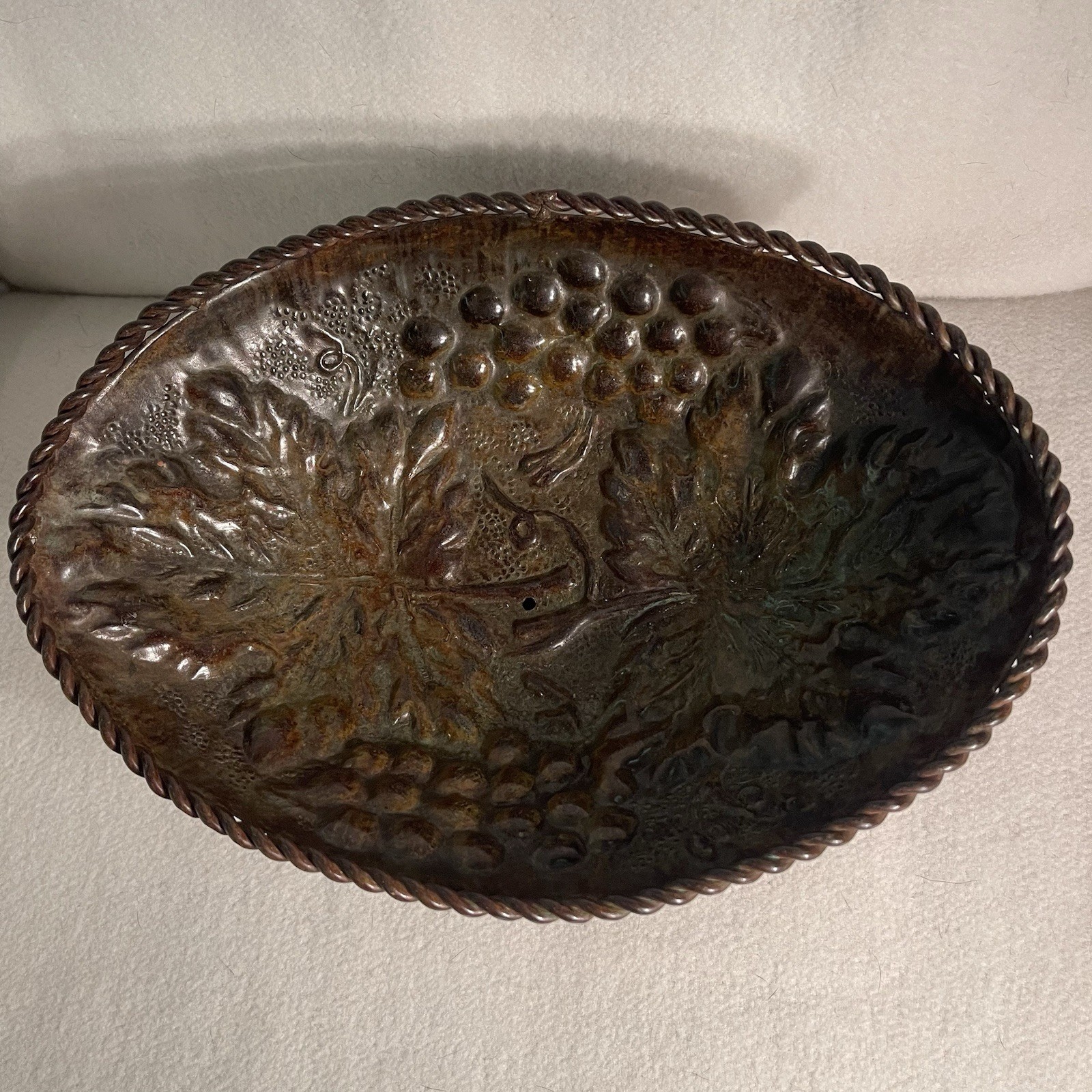 This vintage metal bronze fruit bowl features an embossed grape and leaf pattern, adding a decorative touch to any table setting. The oval-shaped bowl has a rustic style and brown color, perfect for holding fruits or serving as a unique decor piece. With a rope pattern added to the design, this original piece from the 1990s weighs 1.1 lbs and has dimensions of 10.5" in length, 3.75" in height, and 7.5" in width. Ideal for adding a touch of charm to your home, this unmarked bowl combines style and functionality for a timeless aesthetic. Excellent condition. No dents or scratches.