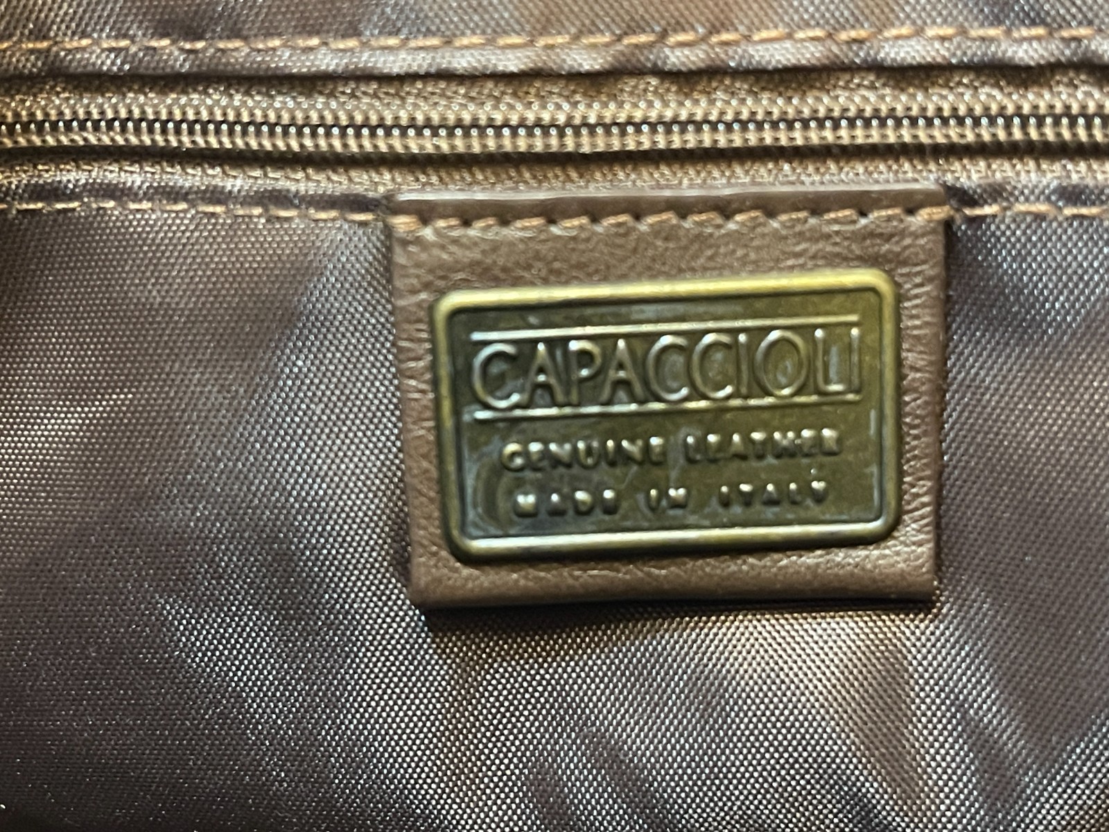 VINTAGE shoulder bag in NEW condition, unused. Most likely from the 80's or the very early 90's. Bag Details: CAPACCIOLI, Brown, soft glove Italian leather shoulderbag, with rabbit fur trim and brass studds. 2 braided leather handles, zip top, interior zip pocket & pouch. Approximate size 14 x 10 x 2 inch